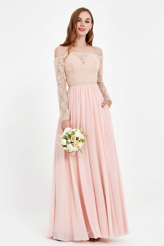 Flowy Chiffon Lace off the shoulder Bridesmaid Dress Long sleeves Formal Evening Party DressesThis stunning long gown features a sultry off-the-shoulder neckline completed with an exquisite fitted lace bodice. long sleeves. flowy full skirts. and handy pockets for keeping small stuff. This maxi dress is perfect for the bridal party. prom party or any special occasion. Silhouette: A-Line Fabric: Chiffon. Lace Length: Floor-Length...Liquid syntax error (snippets/product-attribute line 6): Expected end_of_string but found colon in "{{settings.product_attribute_text | replace: '[option]' : product_attribute_option }}"