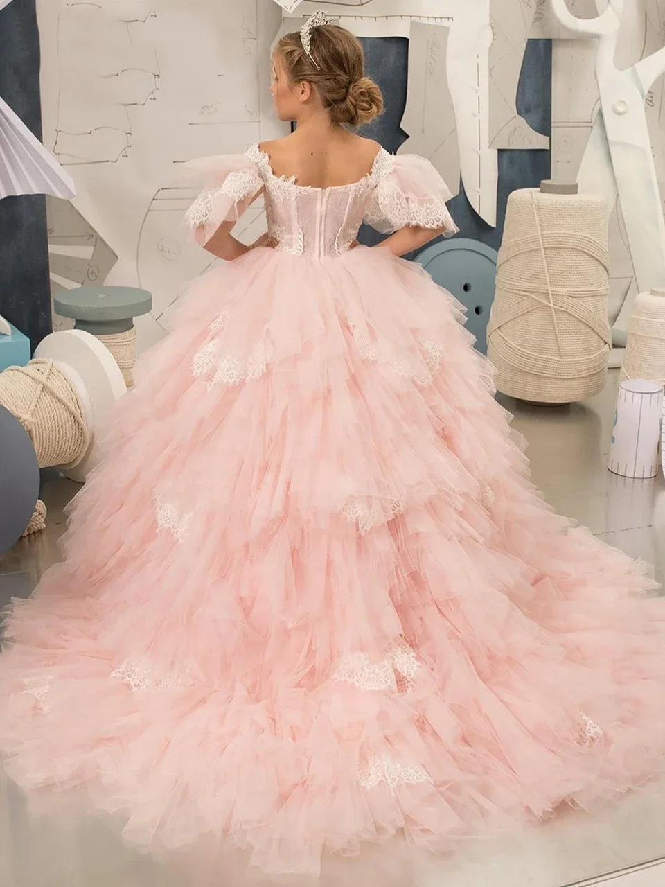 Applikationen Rüschen Tiered Prinzessin Mädchen Kinder Geburtstag Ballkleid Erstkommunion Kleider Rosa Blumenmädchenkleider für Hochzeit