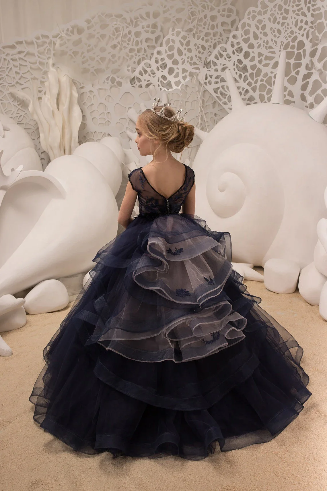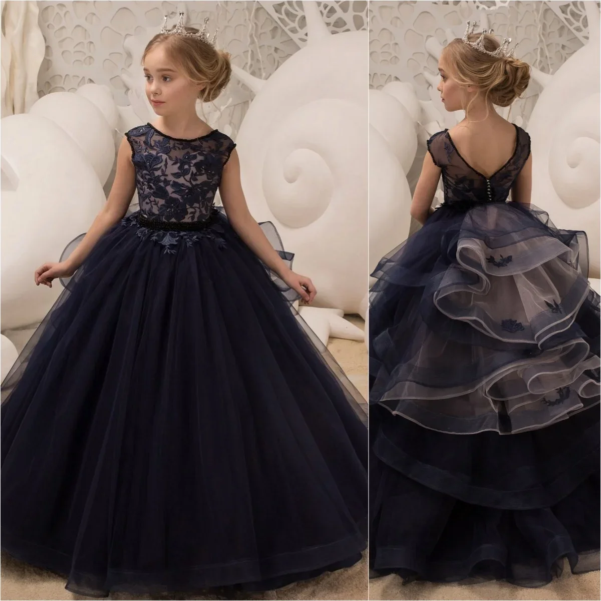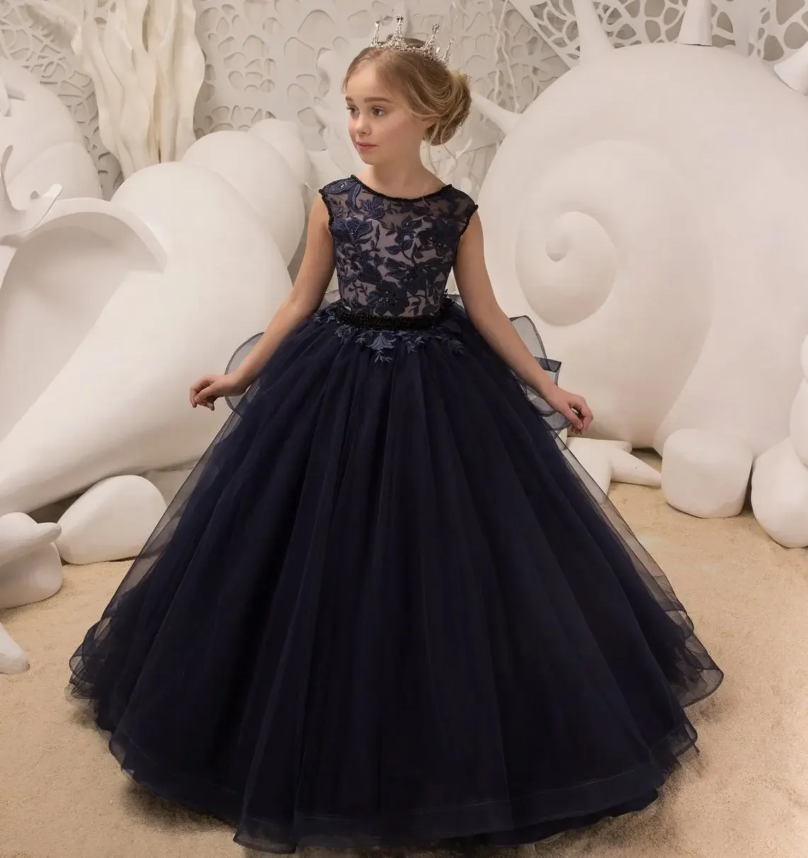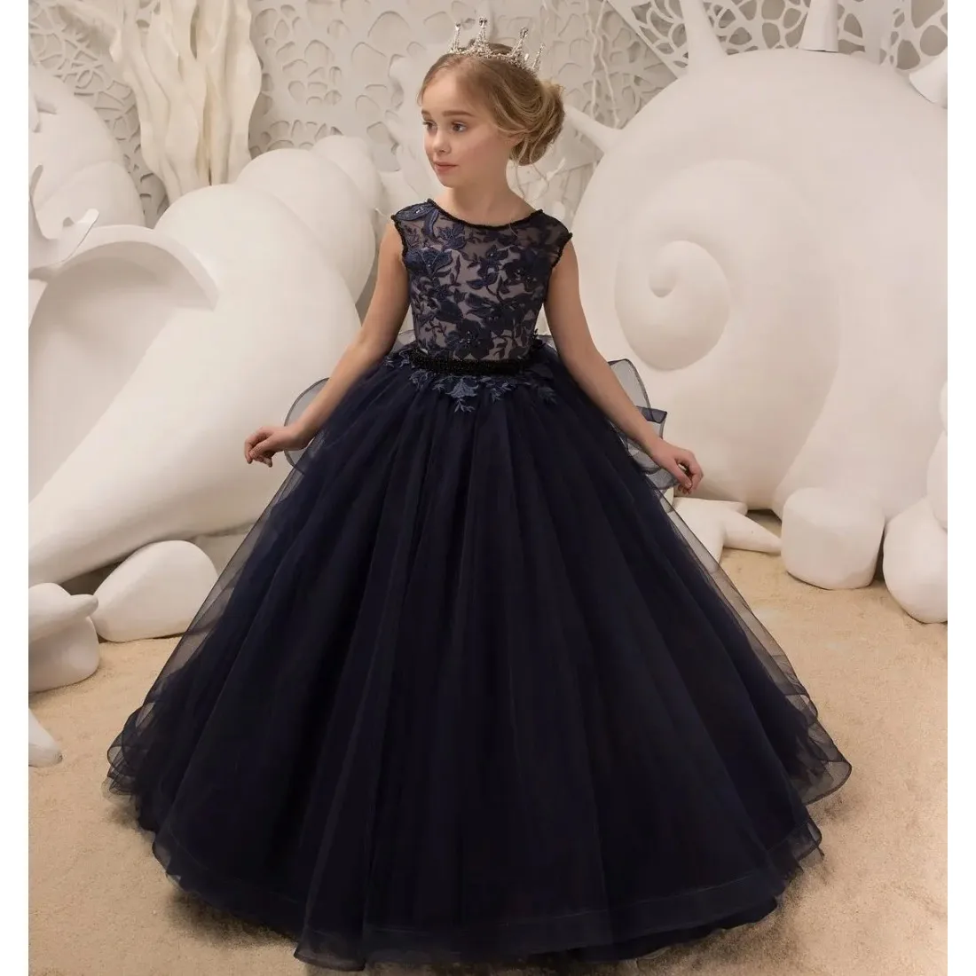 Baby für Hochzeit Spitzenapplikationen Bänder Baby Kinder Abendgarderobe für Fotoshooting Erstkommunionkleider Marineblaue Blumenmädchenkleider