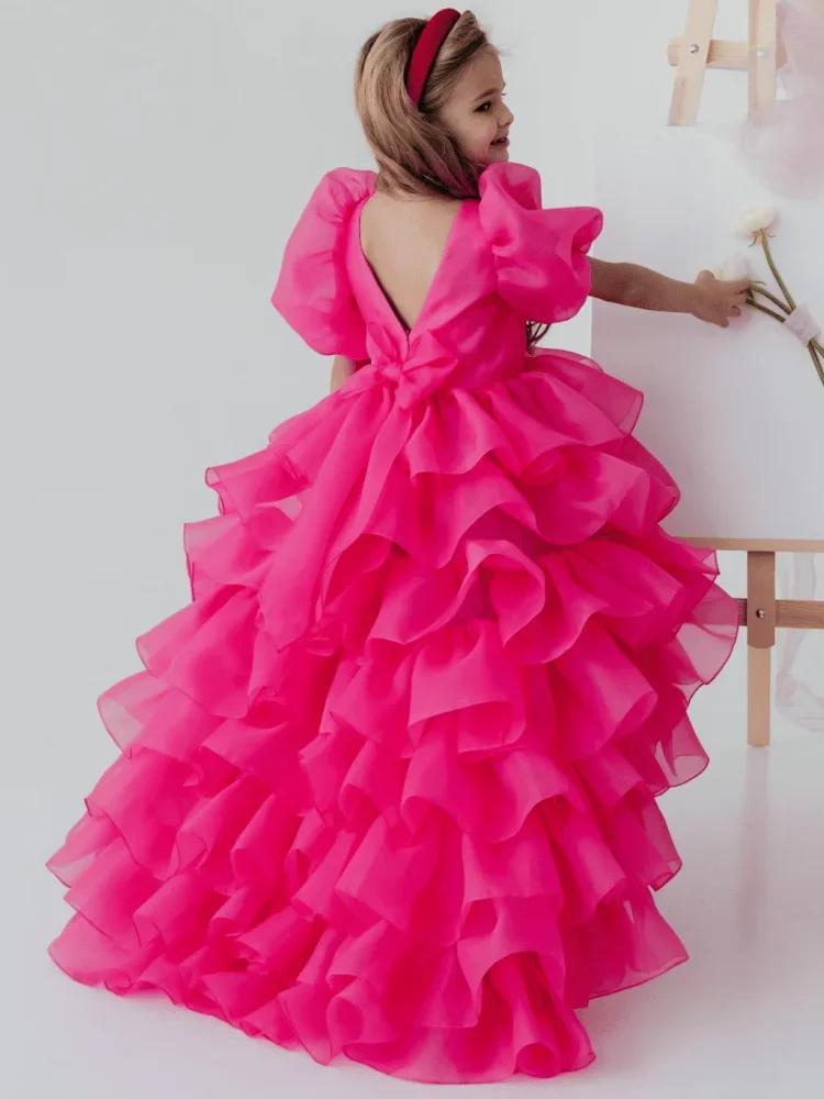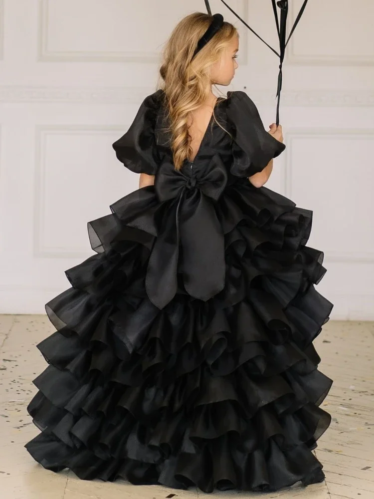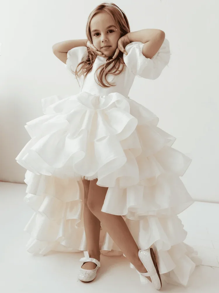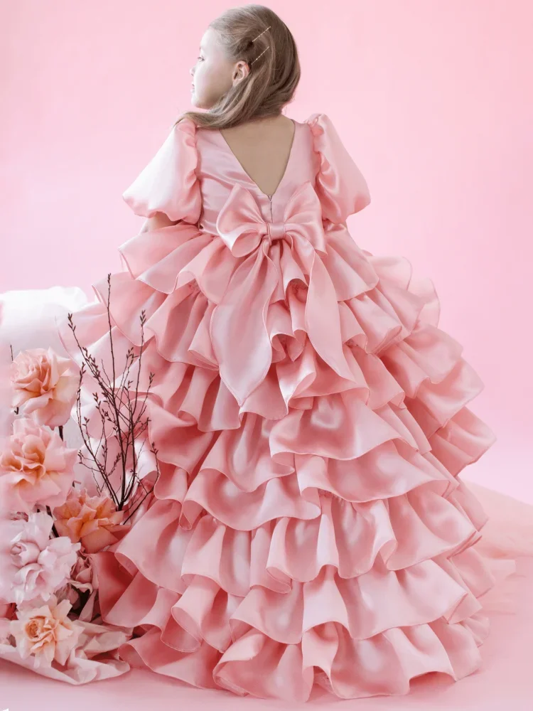 Beige gestuft mit Schleife und Tailing Kurzarm für Hochzeit Geburtstagsfeier Heilige Kommunion Kleider maßgeschneiderte Blumenmädchenkleider