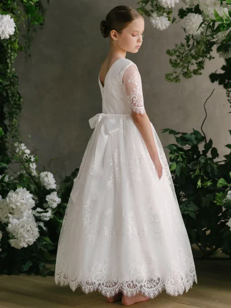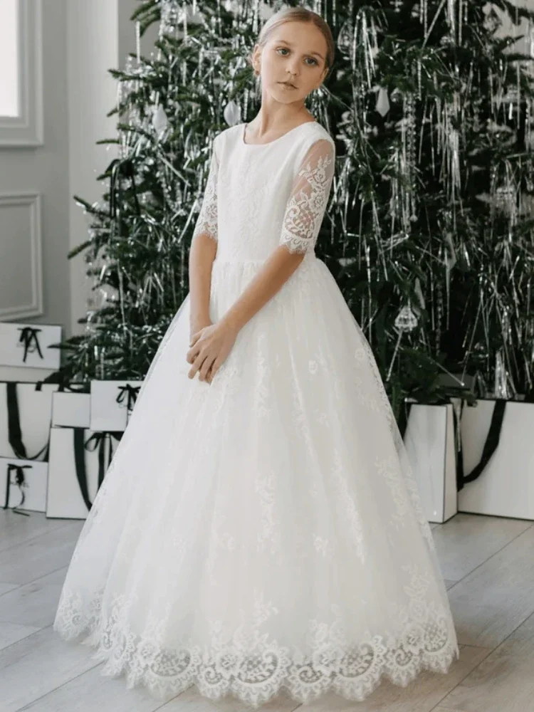 Geburtstag Erstkommunion Kleider Blumenmädchen Kleider Weiß Tüll Spitze Applikationen Mit Bogen Halbe Hülse Für Hochzeit