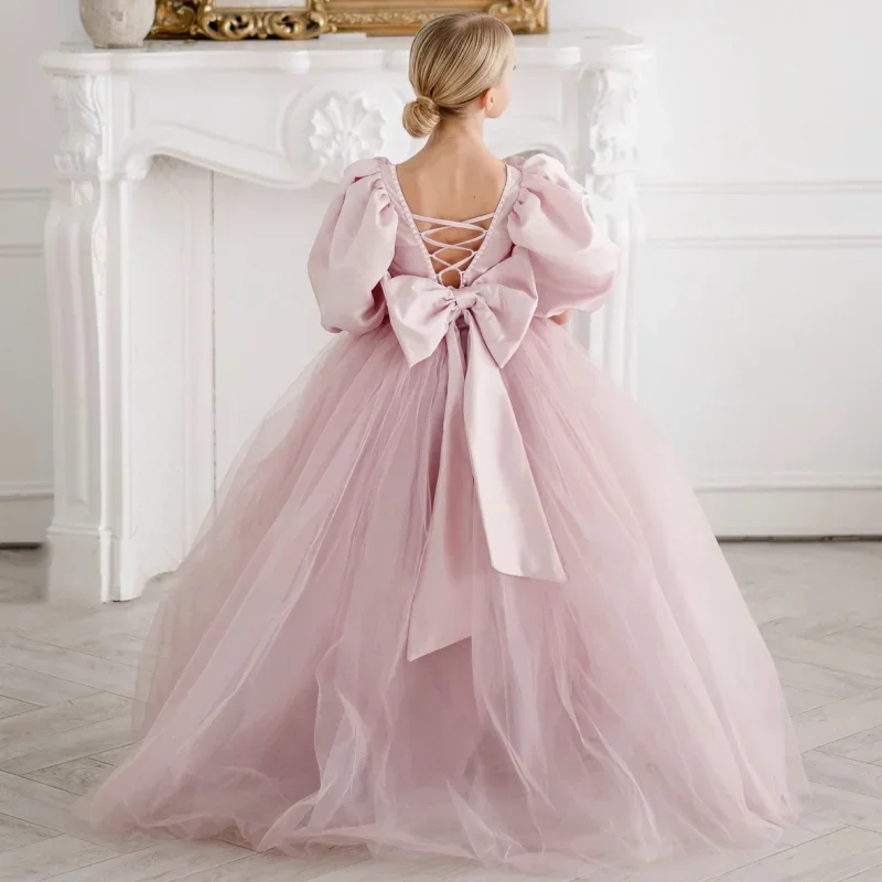 Geburtstag Heilige Kommunion Bankett Prinzessin Kleider Blumenmädchen Kleider Staubigen Rosa Perlen Hals Mit Bogen Halbe Hülse Für Hochzeit