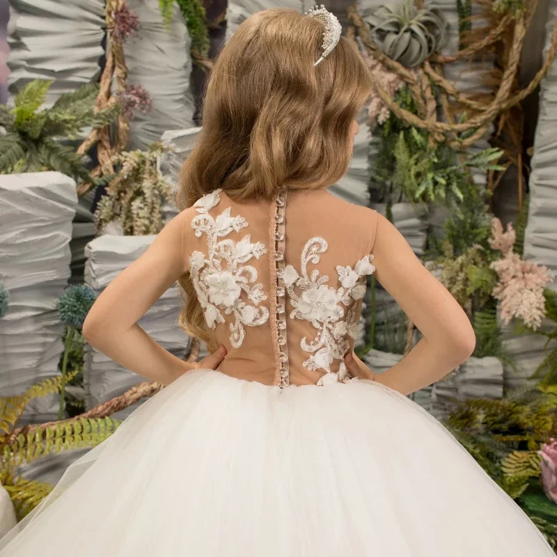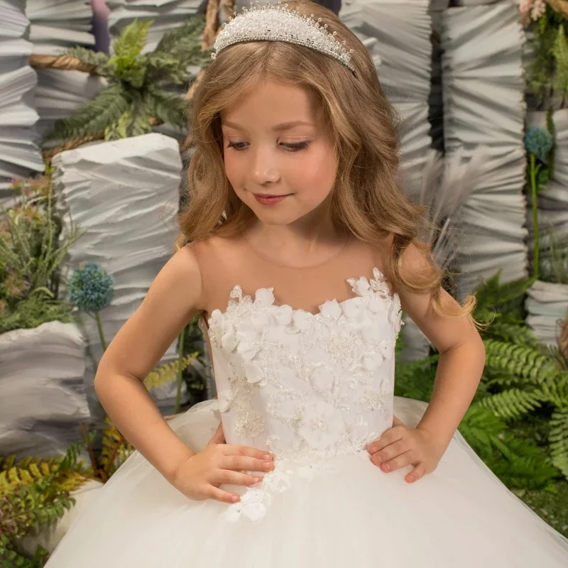 Geburtstagsfeier Bankett Erstkommunion Kleider Blumenmädchenkleider Weißer Tüll Puffy Flory Muster Ärmellos Für Hochzeit