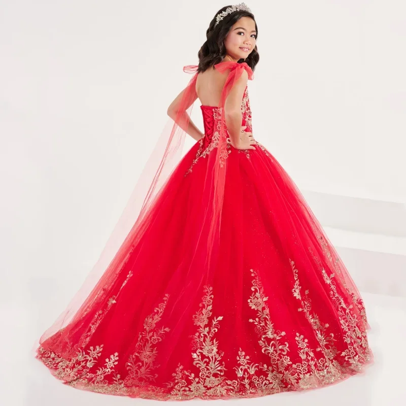 Geburtstagsfeier Bankett Prinzessin Kleid Blumenmädchenkleider Roter Tüll Gold Flory Applikationen Mit Schleife Schulter Ärmellos Für Hochzeit