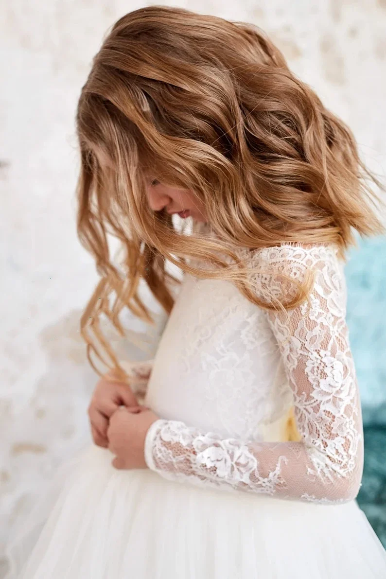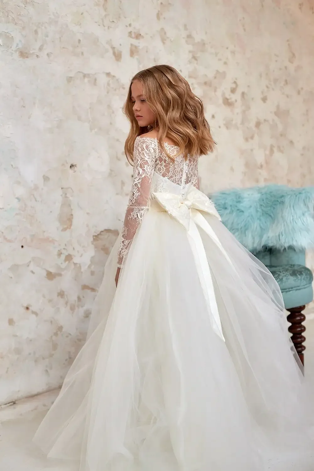 Boho Tüll Elfenbein Weiß Spitze Schleife Mädchen Erstkommunion Kleid Junior Brautjungfernkleid Maßgeschneidert Vollärmeliges Blumenmädchenkleid