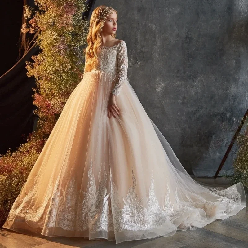 Champagner Weiß Muster Applikationen Langarm Für Hochzeit Geburtstag Party Bankett Prinzessin Kleider Angepasst Blumen Mädchen Kleider