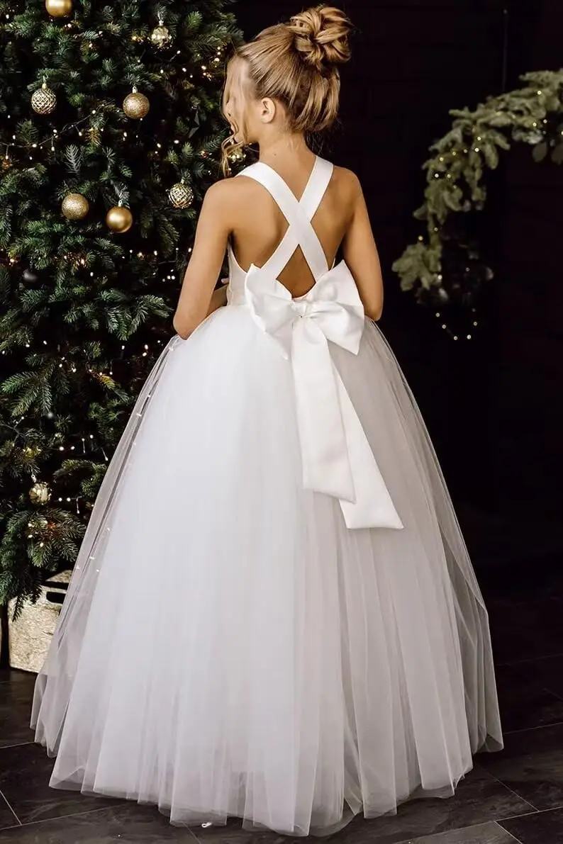Blumenmädchenkleid mit gekreuzten Trägern, langes Satin-Ballkleid mit Schleife, bauschiges Tüll-Festzugskleid für Mädchen, Prinzessinnenkleid