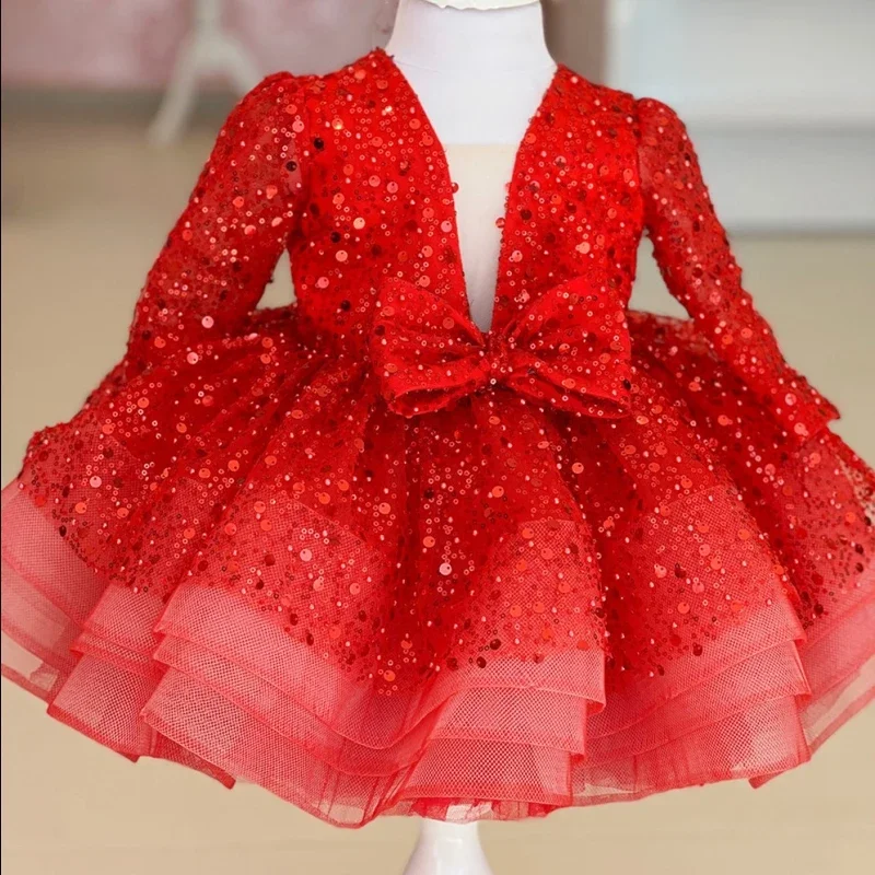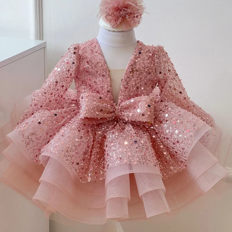 Niedliche rosa Glitzer Pailletten glänzende geschwollene Organza mit Schleife Fit Hochzeit Party Prinzessin Ballkleider maßgeschneiderte Blumenmädchenkleider