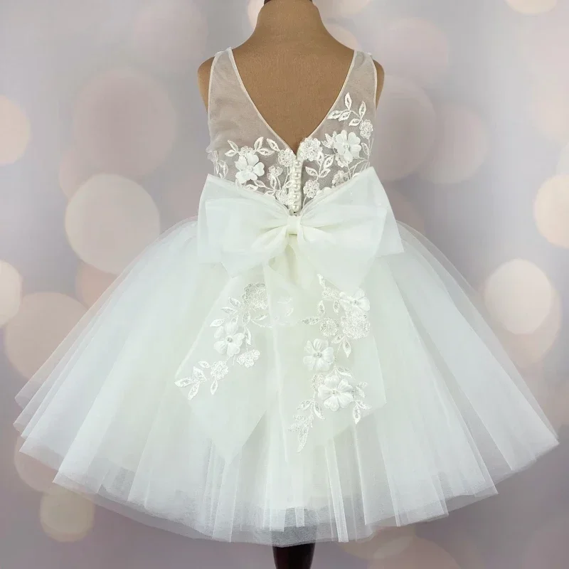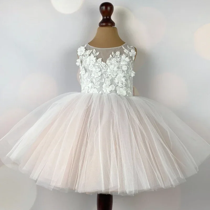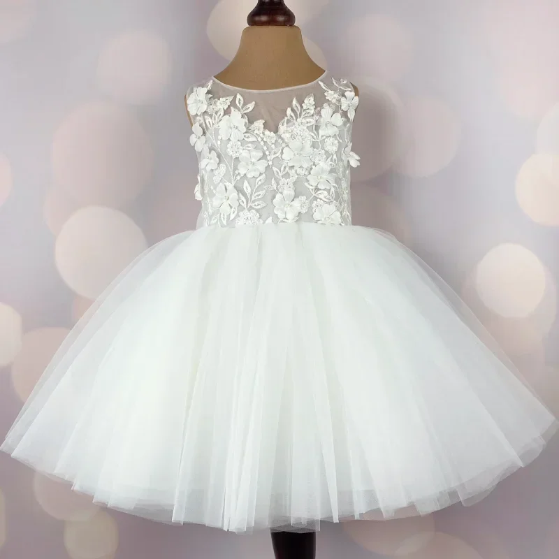 Erstkommunionkleid Maßgeschneiderte weiße Blumenmädchenkleider für die Hochzeit ärmellos 3D-Blumen mit Schleife bodenlang