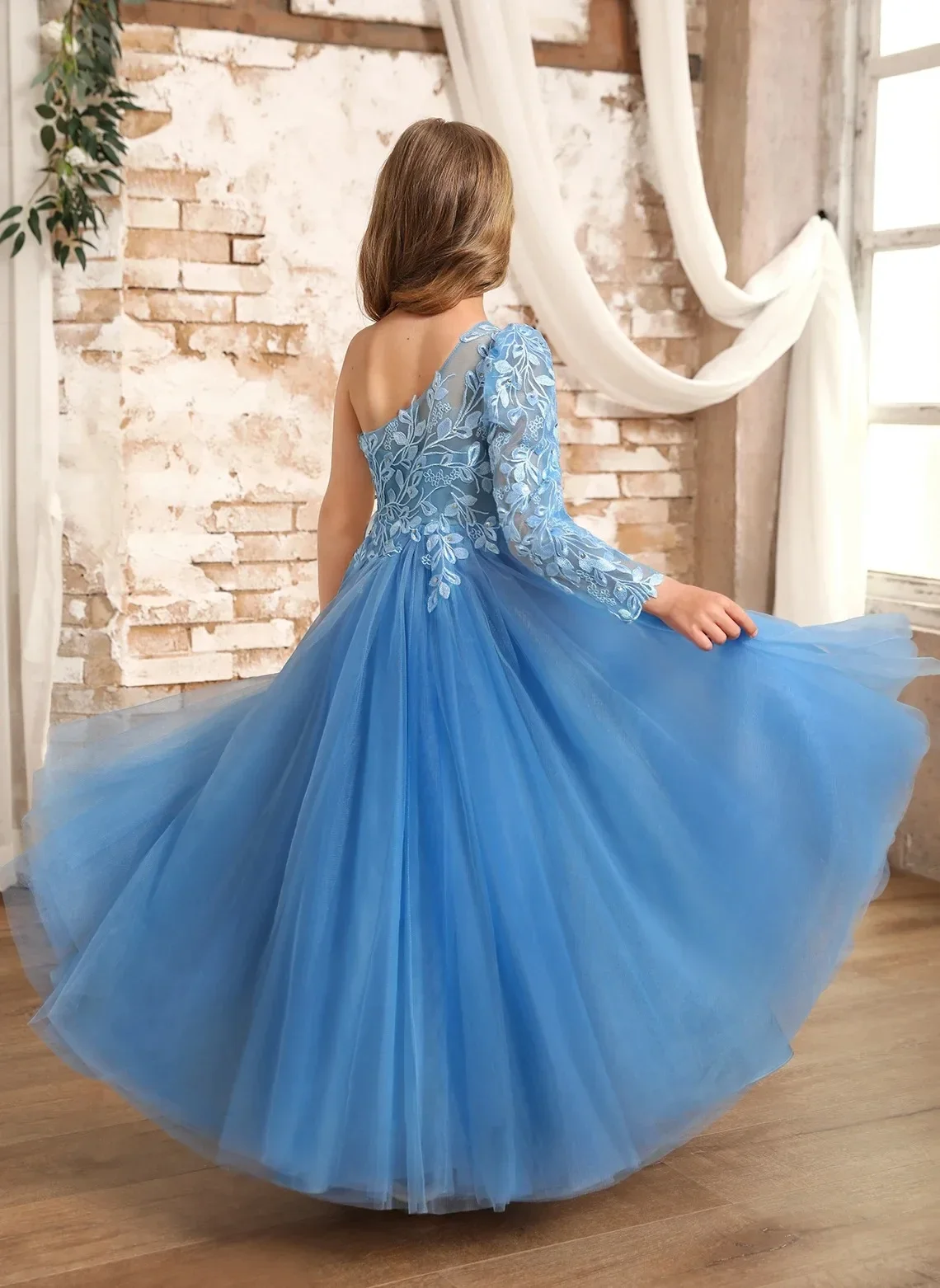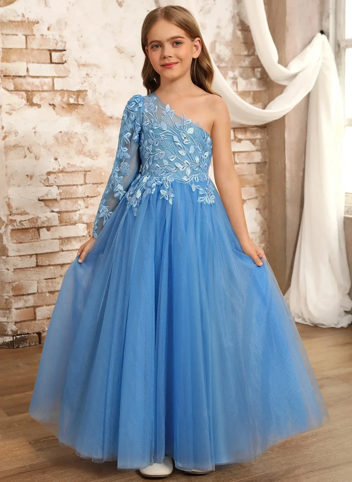 Erstkommunion Kindergeburtstagsfeier Kleid Partykleider Maßgeschneiderte blaue One-Shoulder-Blumenmädchenkleider für Hochzeitsprinzessin