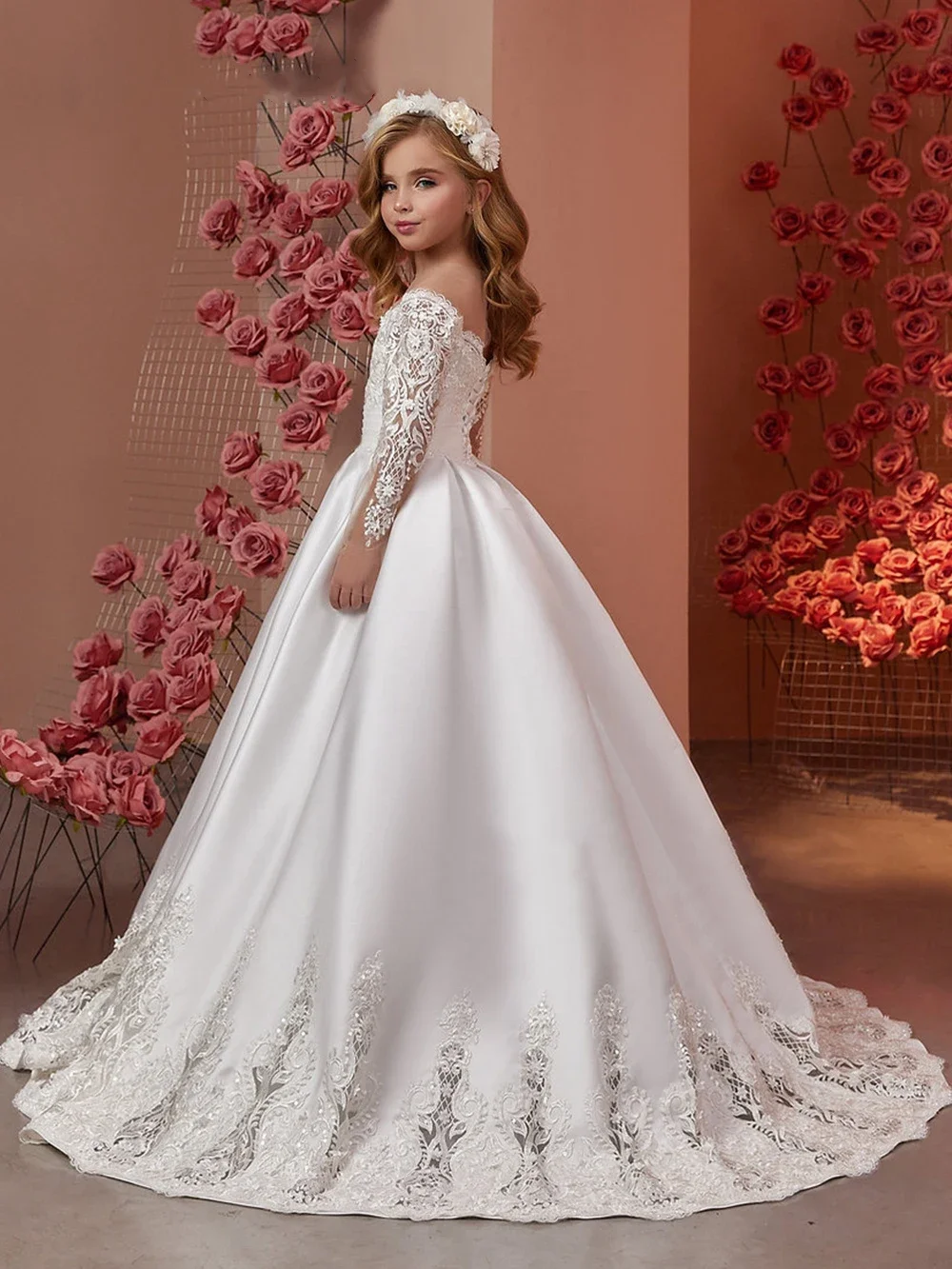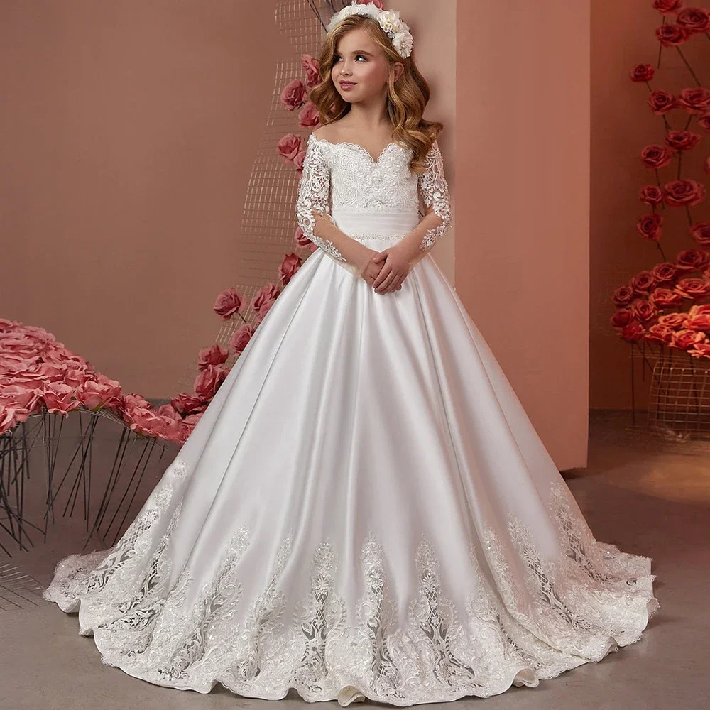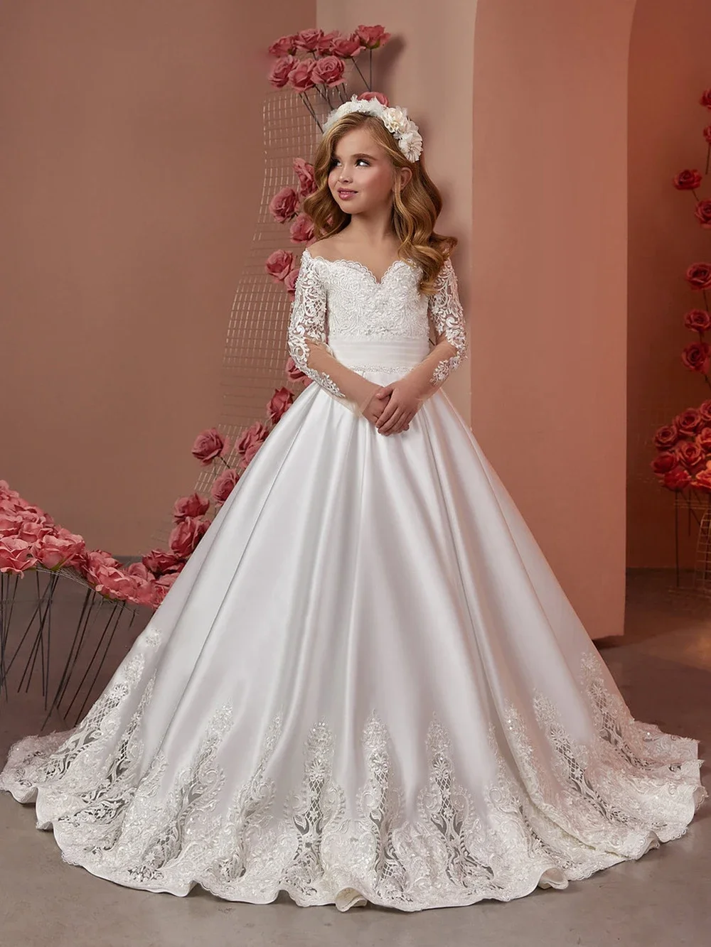 Bodenlanges elegantes Geburtstagsparty-Erstkommunionkleid 2026 weiße Blumenmädchenkleider Festzugskleid für Hochzeit Satin-Applikationen