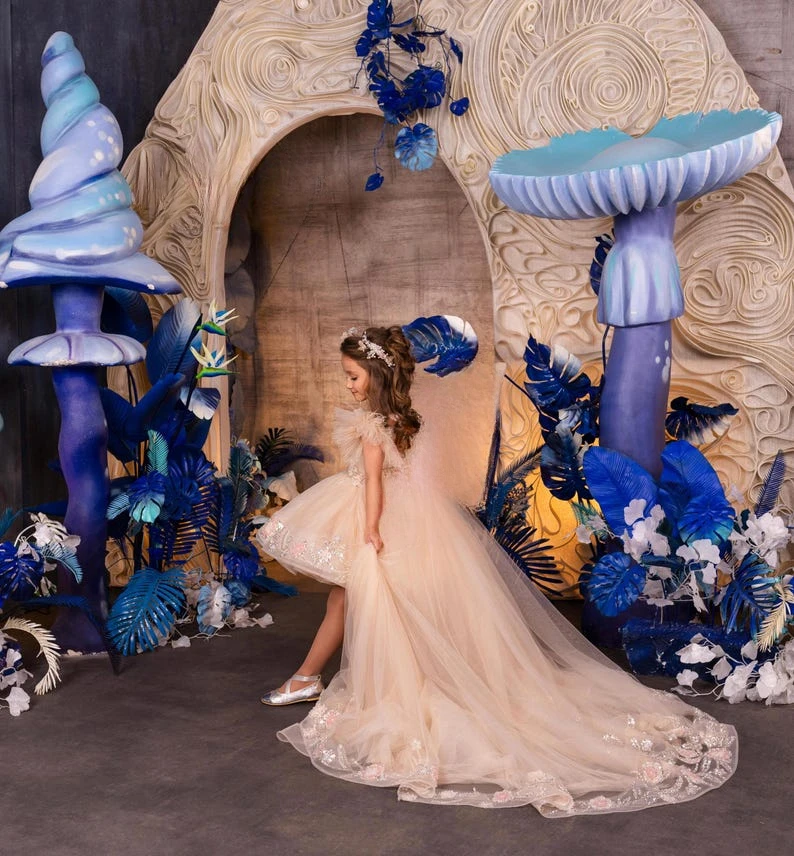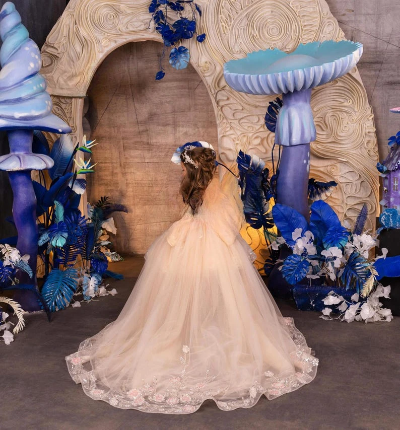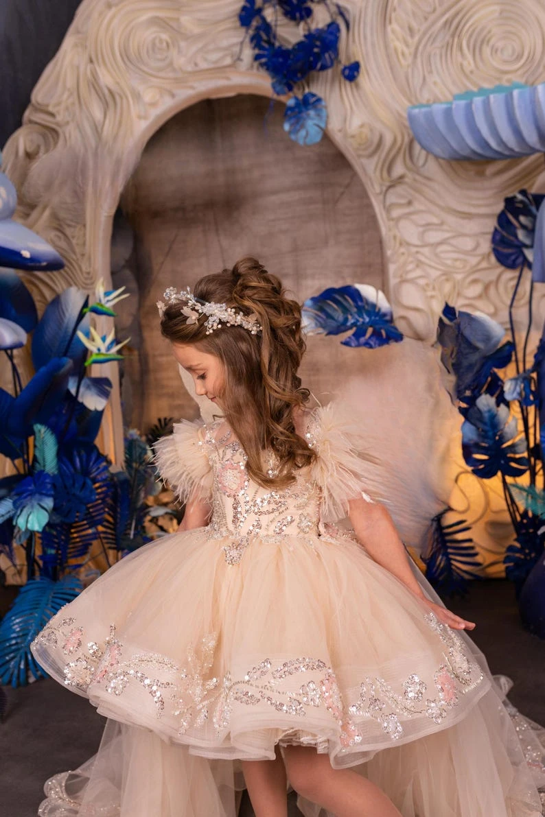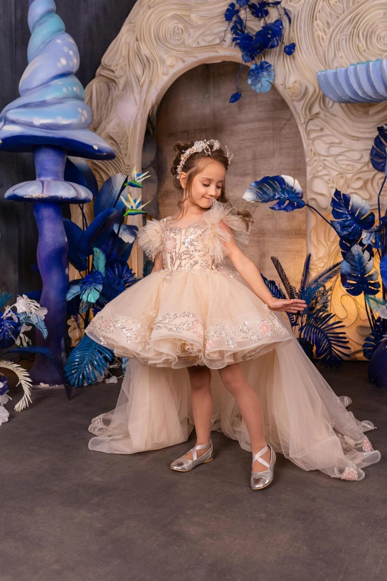 Wunderschönes Cappuccino-Blumenmädchenkleid mit mehrlagigem Rock, Korsett mit Knöpfen und Schnürung. Speziell entworfen mit einzigartigem Mädchenkleidmuster für Ihre schicken besonderen Anlässe: Hochzeit, Geburtstag, Erstkommunion, Festzug, Brautjungfernparty, Weihnachten.