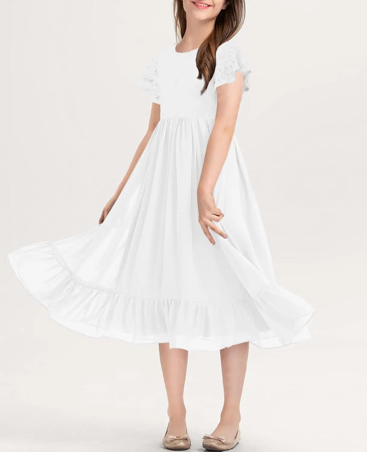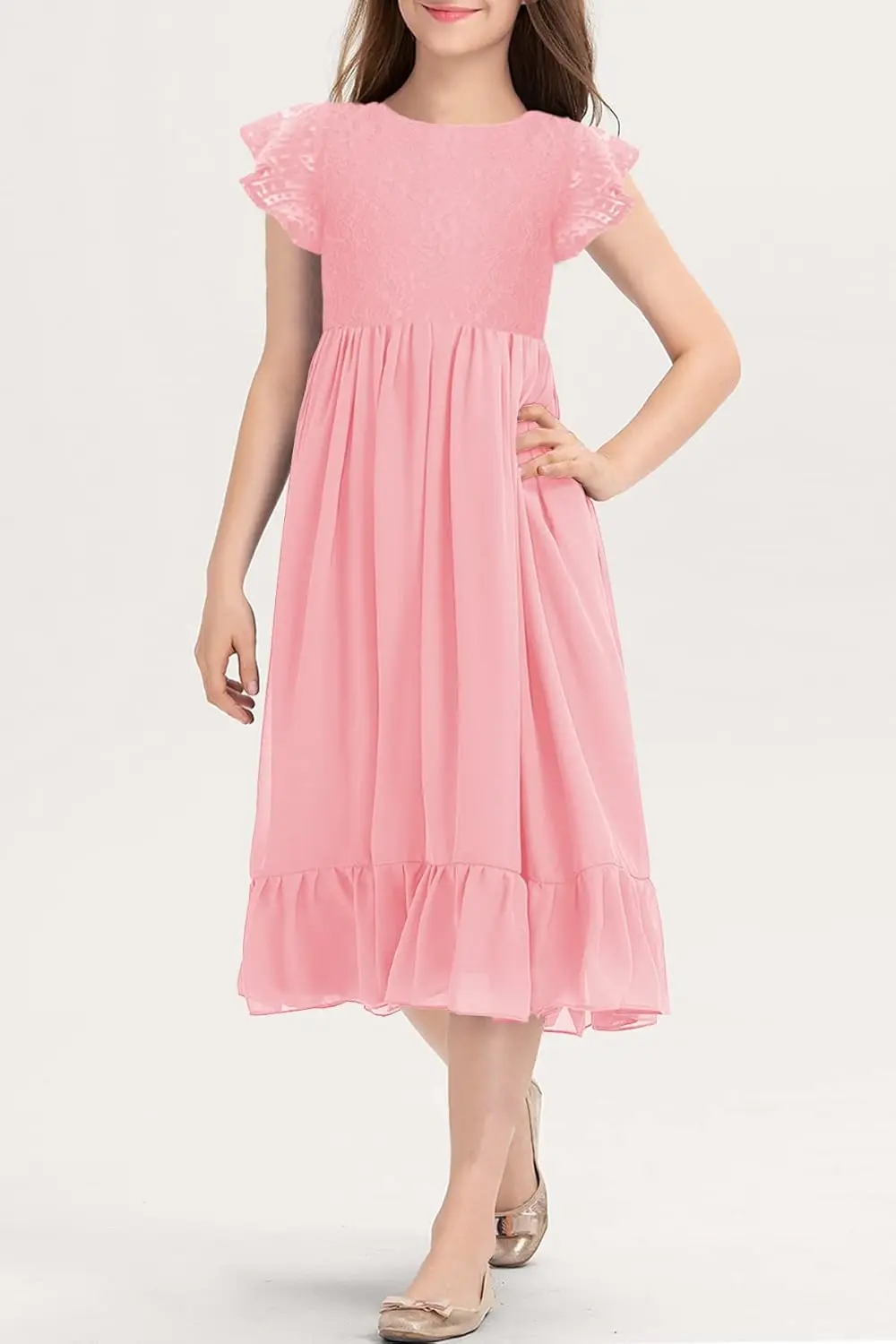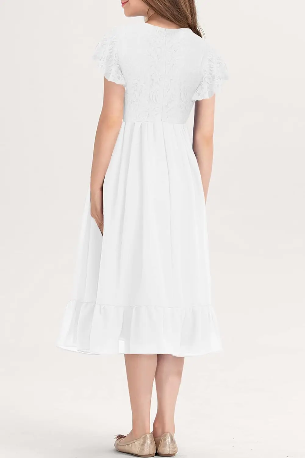 Mädchen Elegantes Spitzenkleid mit Blumenmuster, Rundhalsausschnitt, Rüschen, Chiffon, A-Linie, fließend, für Geburtstagsparty, Midikleid, Ballkleid, Prinzessinnenkleid