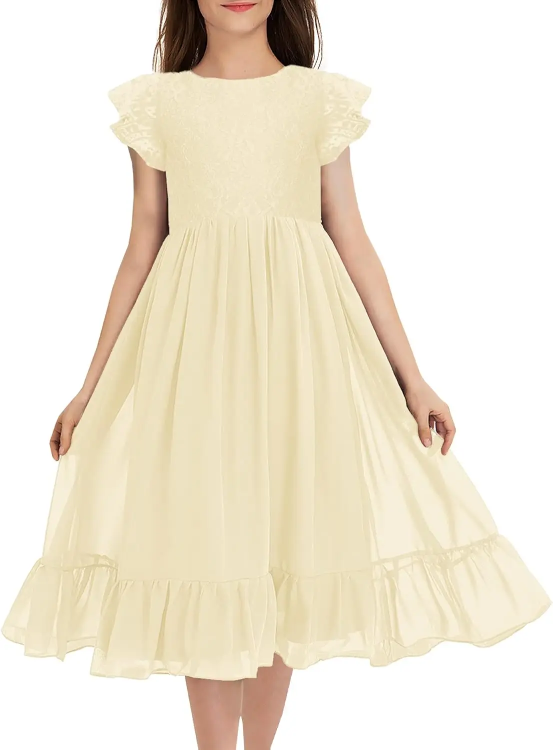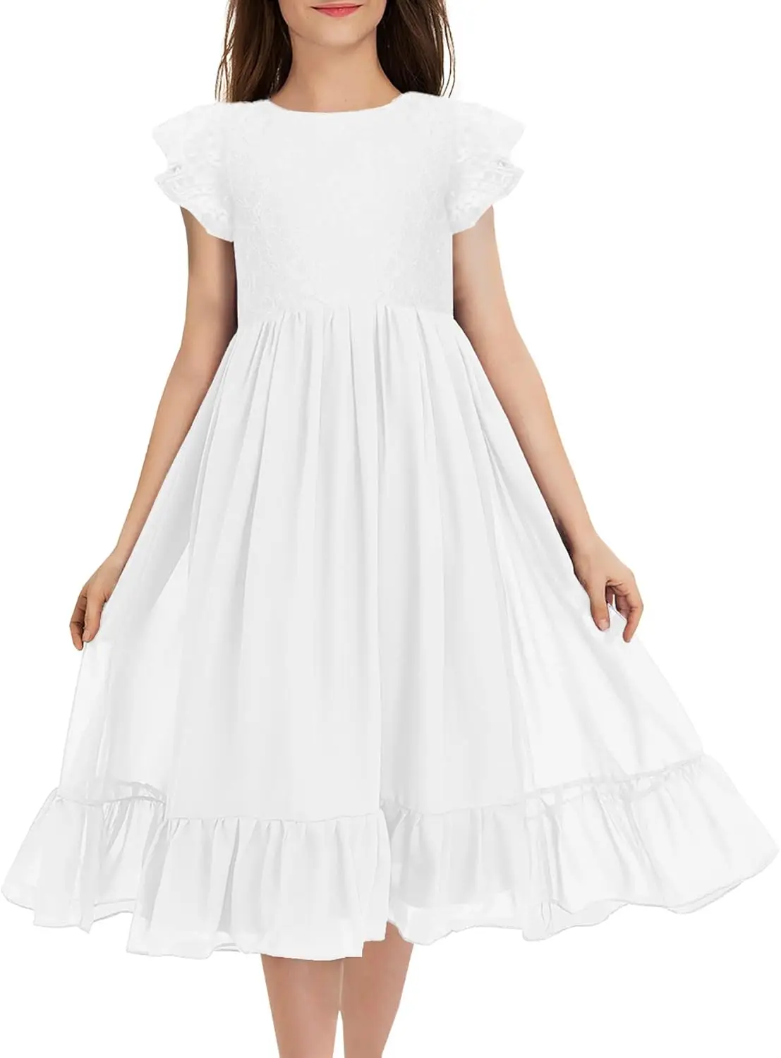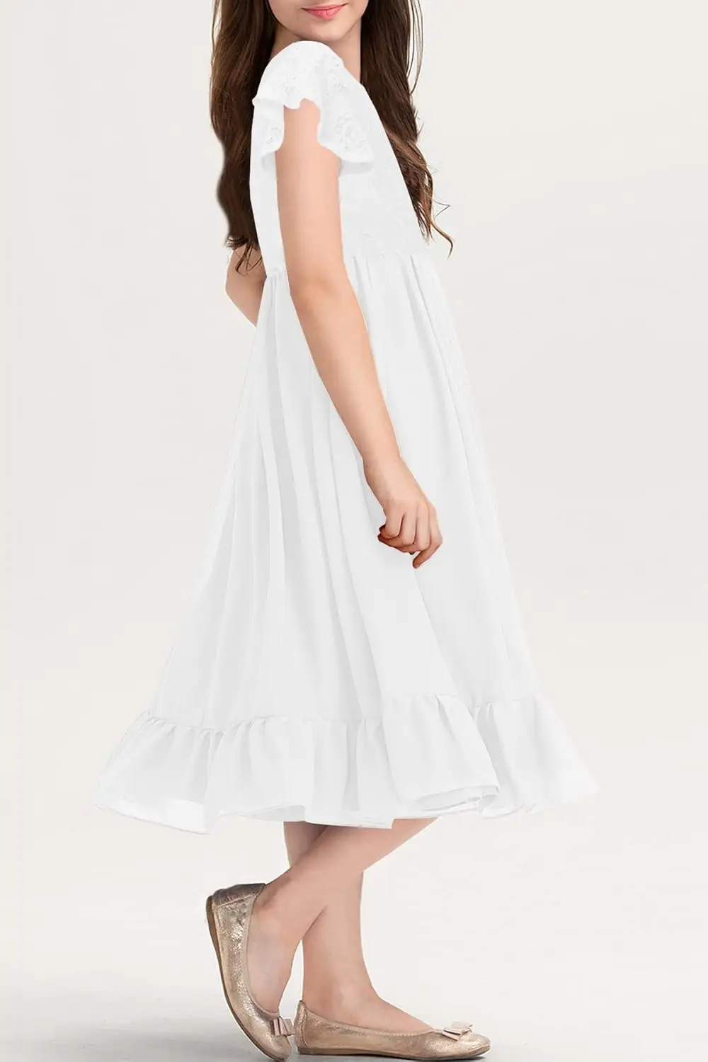 Mädchen Elegantes Spitzenkleid mit Blumenmuster, Rundhalsausschnitt, Rüschen, Chiffon, A-Linie, fließend, für Geburtstagsparty, Midikleid, Ballkleid, Prinzessinnenkleid