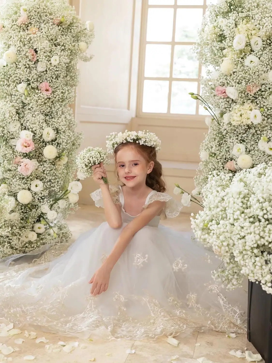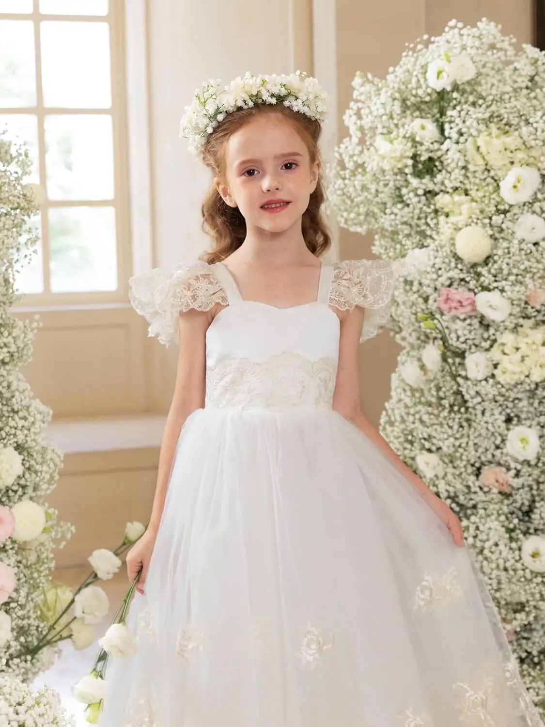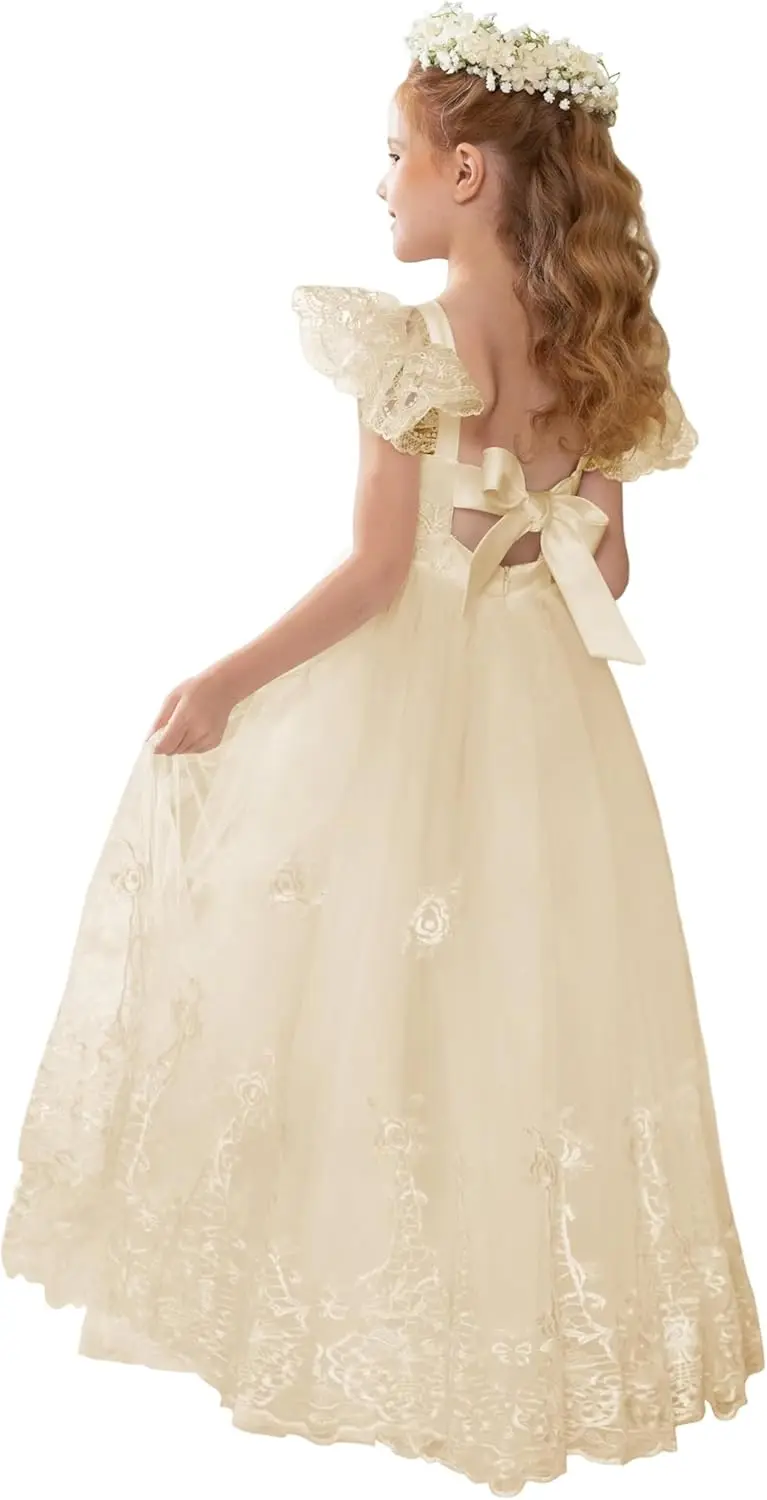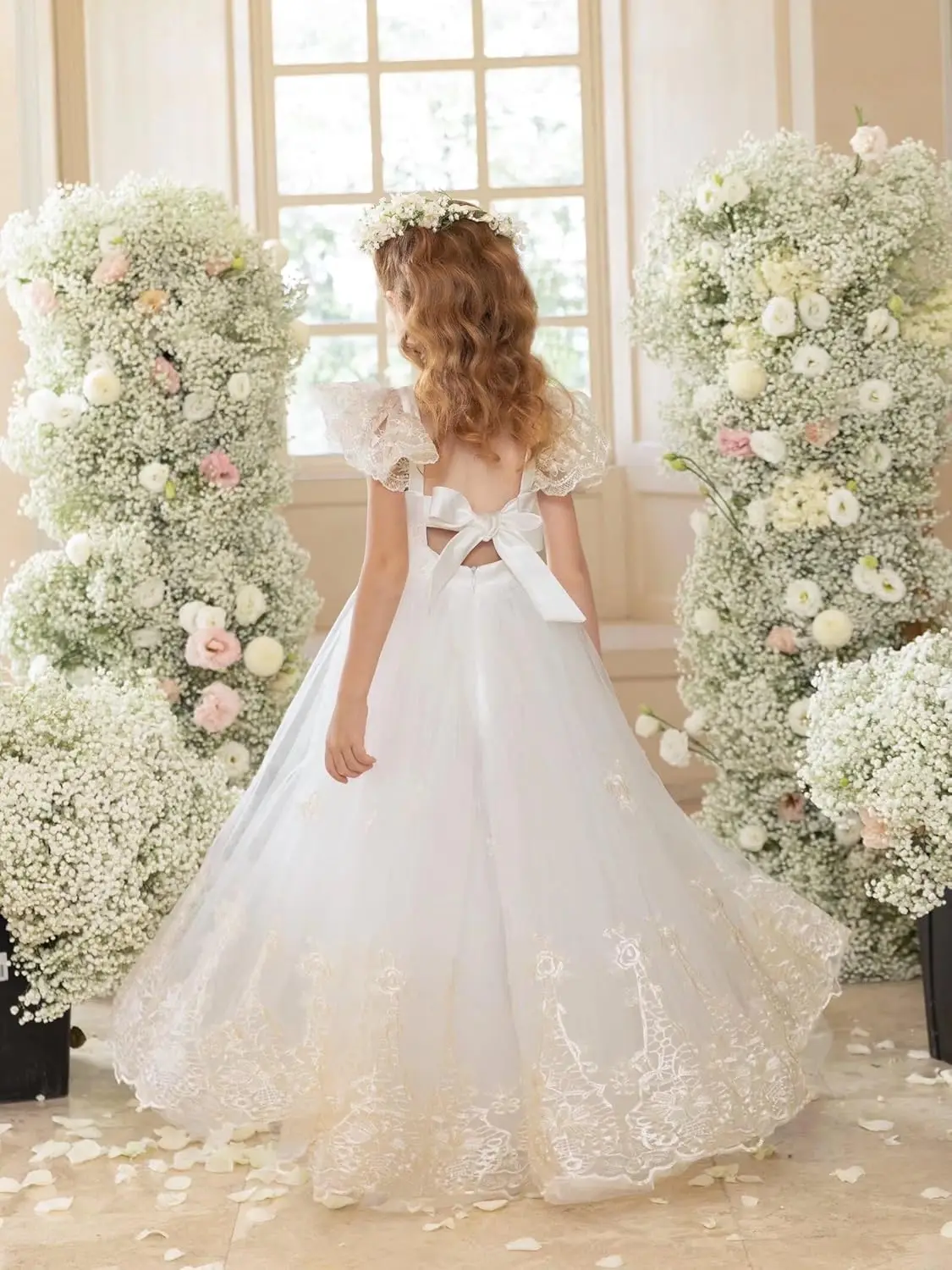 Mädchen Spitzenapplikation Blumenmädchenkleider für Hochzeit 2025 Erstkommunionkleid Party Maxikleid Krawatte Zurück Prinzessinnenkleid