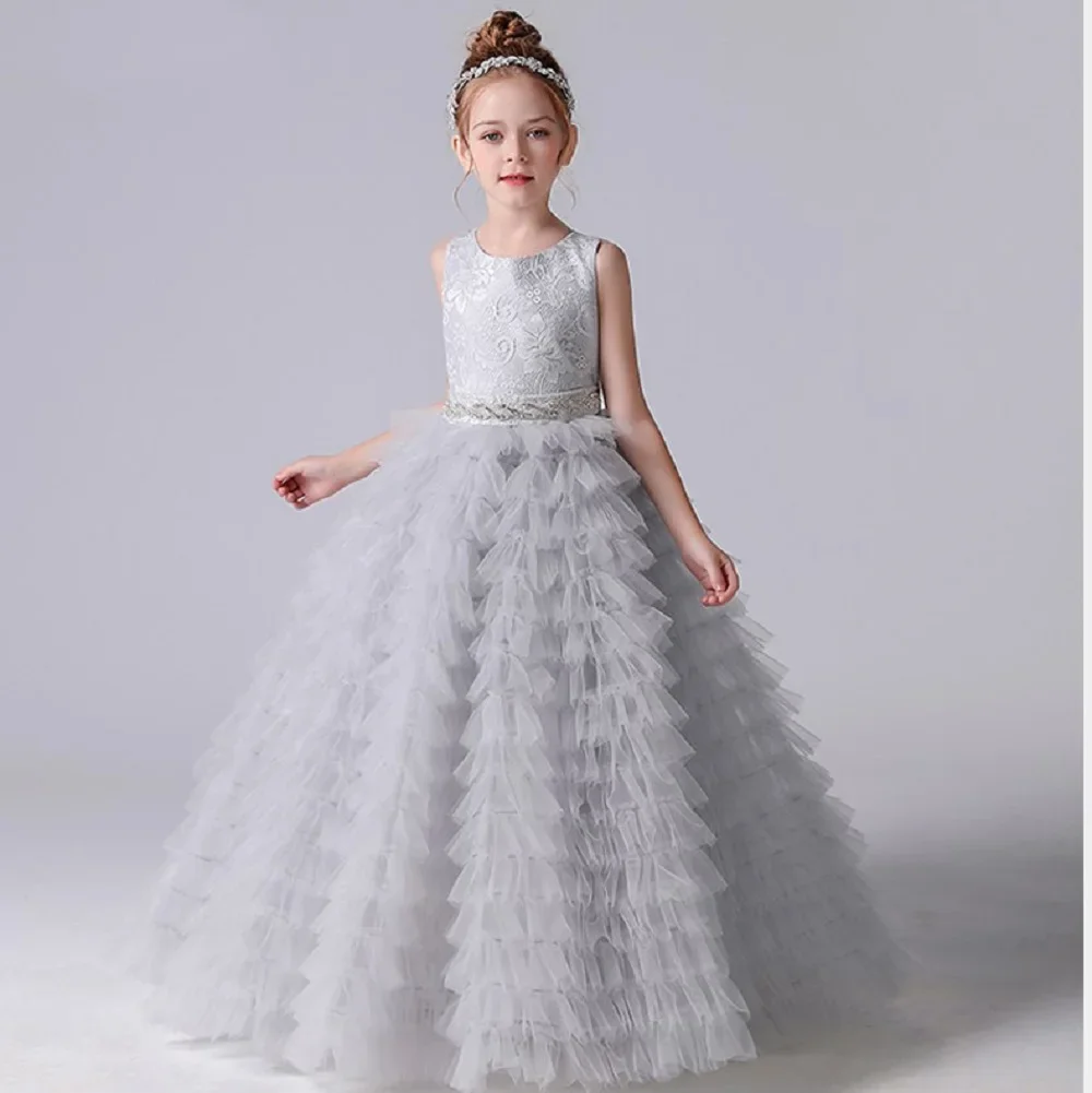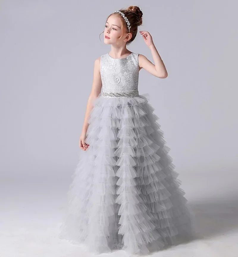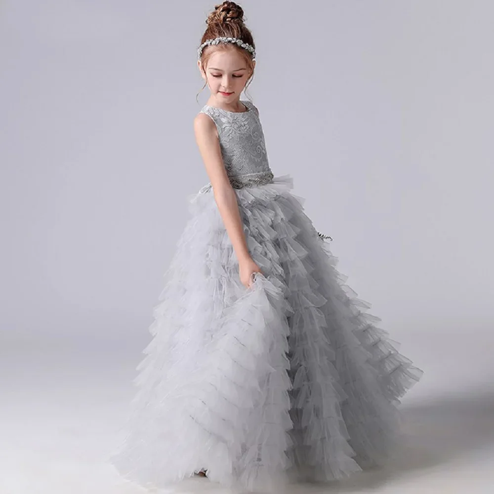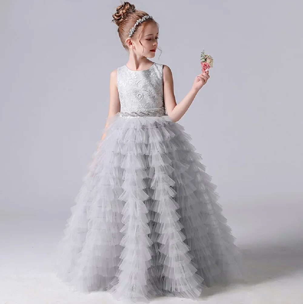 Graue Tüllapplikationen, abgestufter langer Rock, ärmellos für Hochzeit, Geburtstag, Party, Bankett, Prinzessinnenkleider, Blumenmädchenkleider