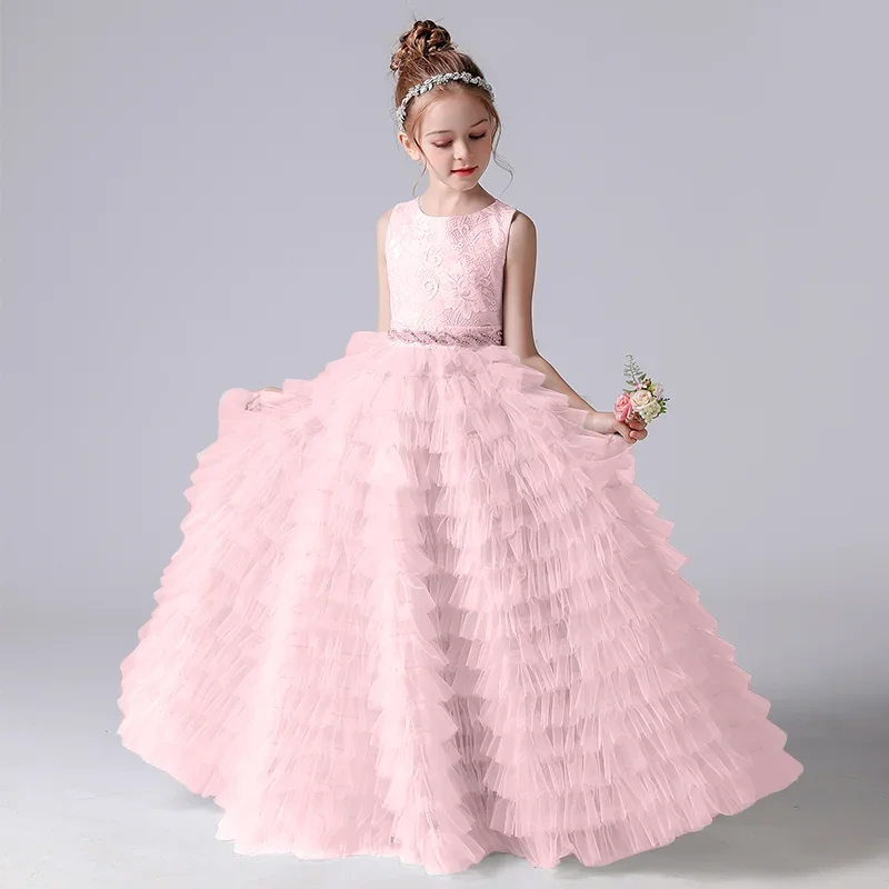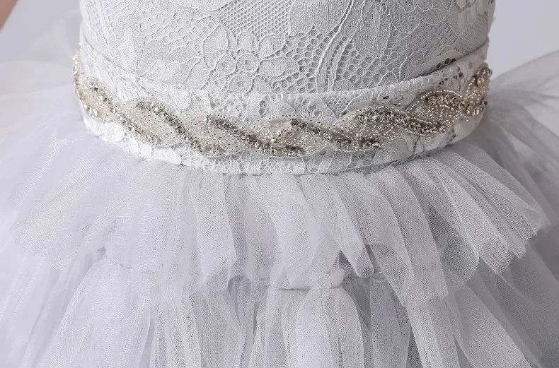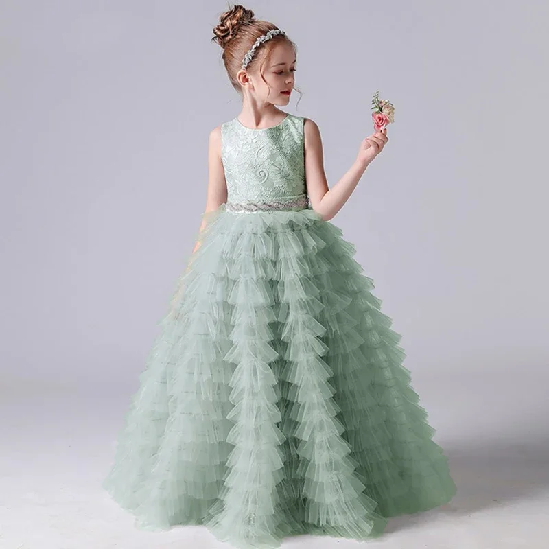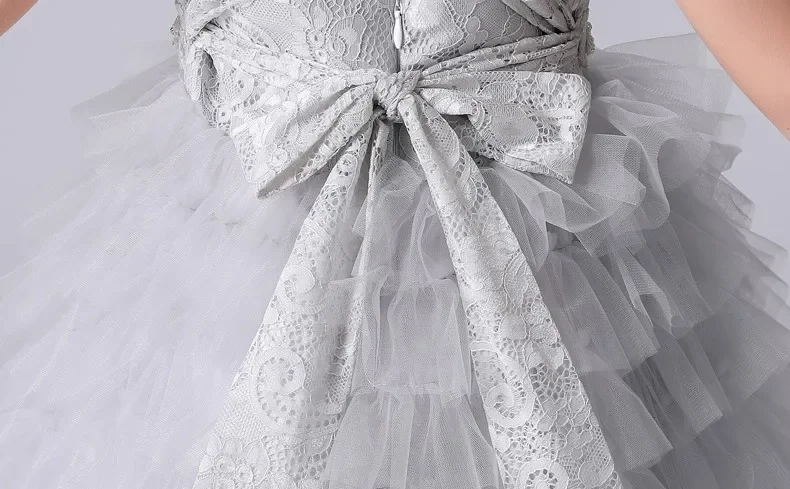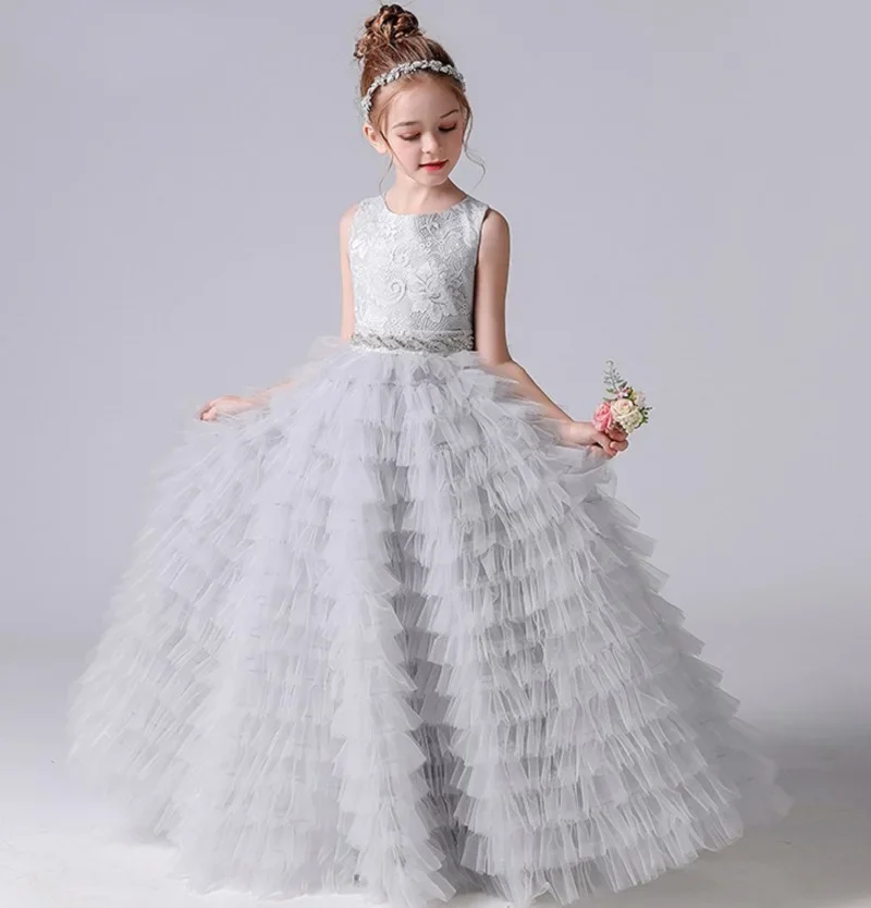 Graue Tüllapplikationen, abgestufter langer Rock, ärmellos für Hochzeit, Geburtstag, Party, Bankett, Prinzessinnenkleider, Blumenmädchenkleider