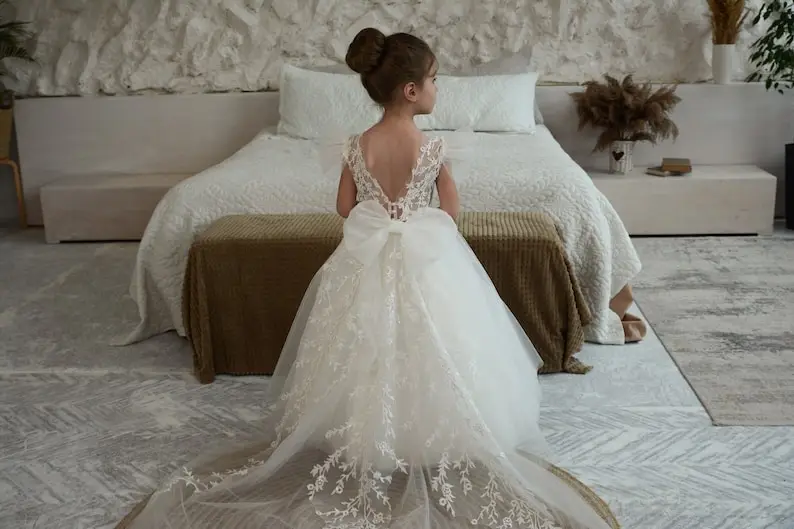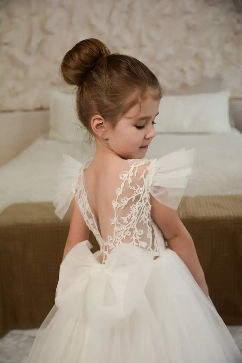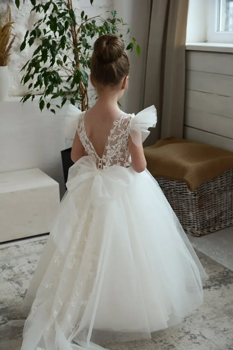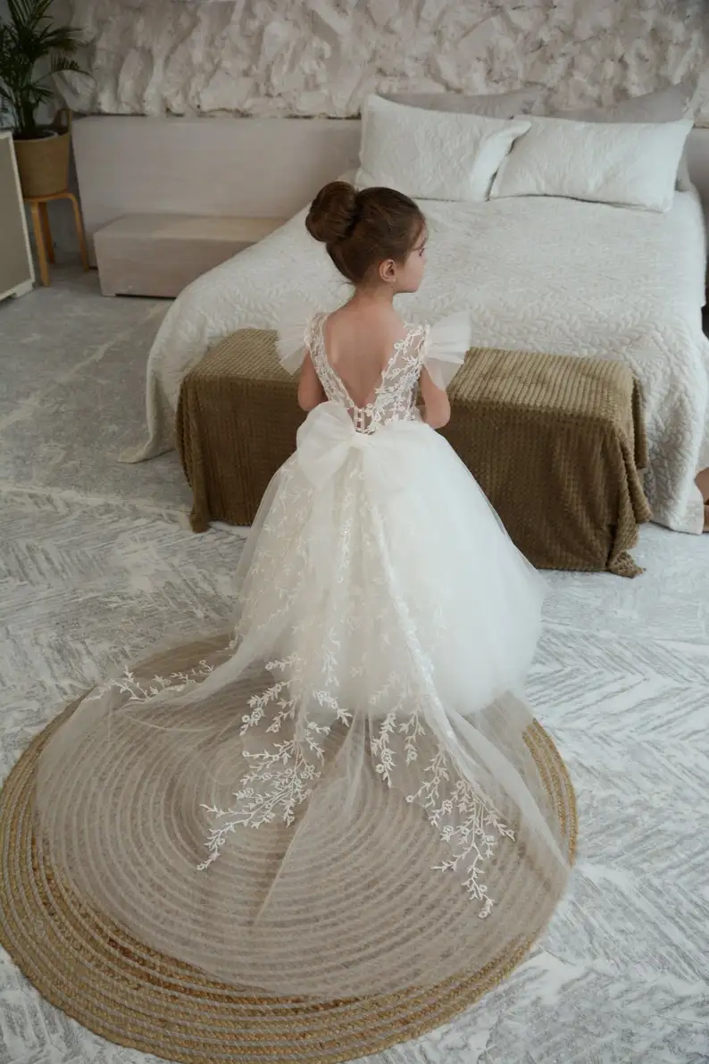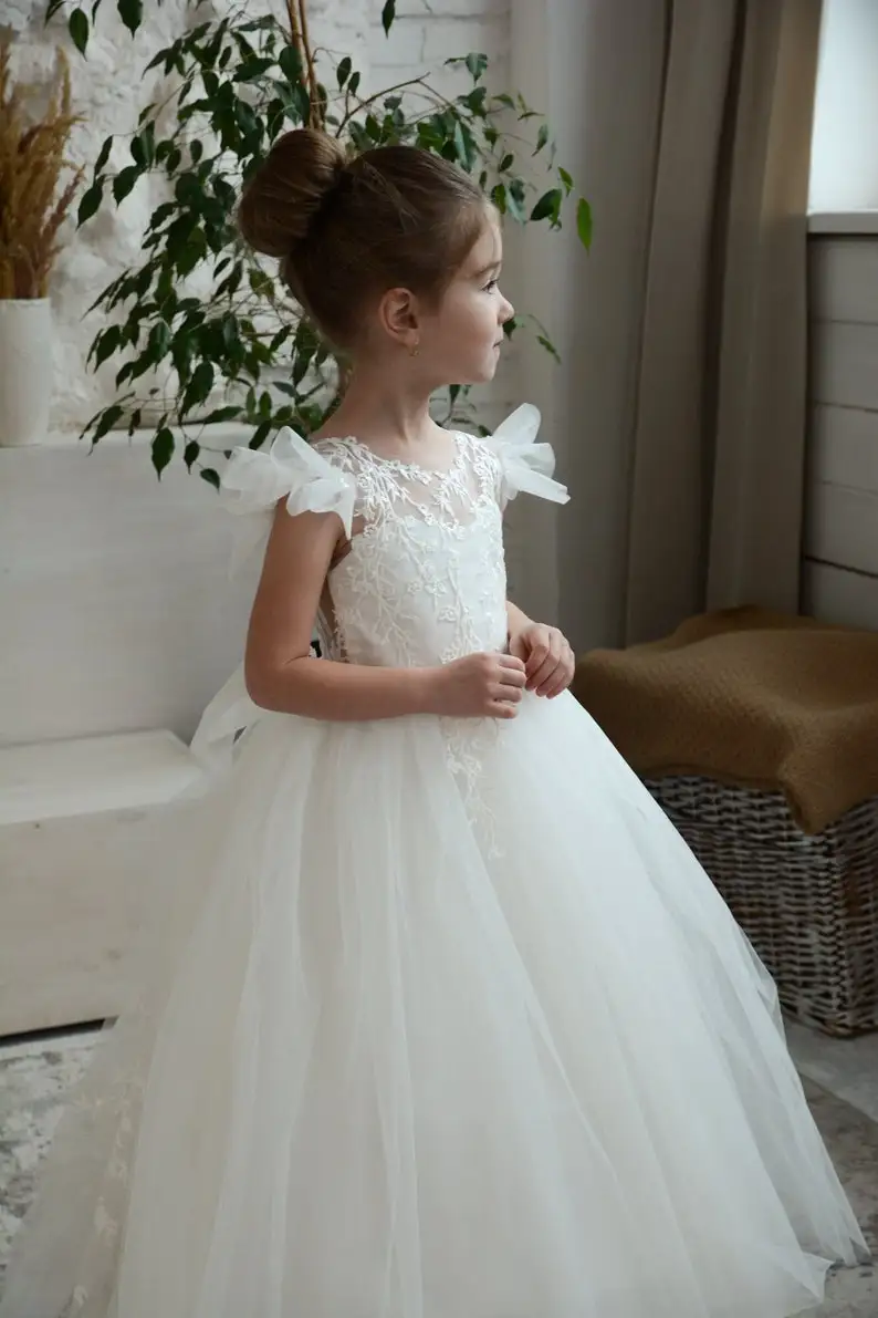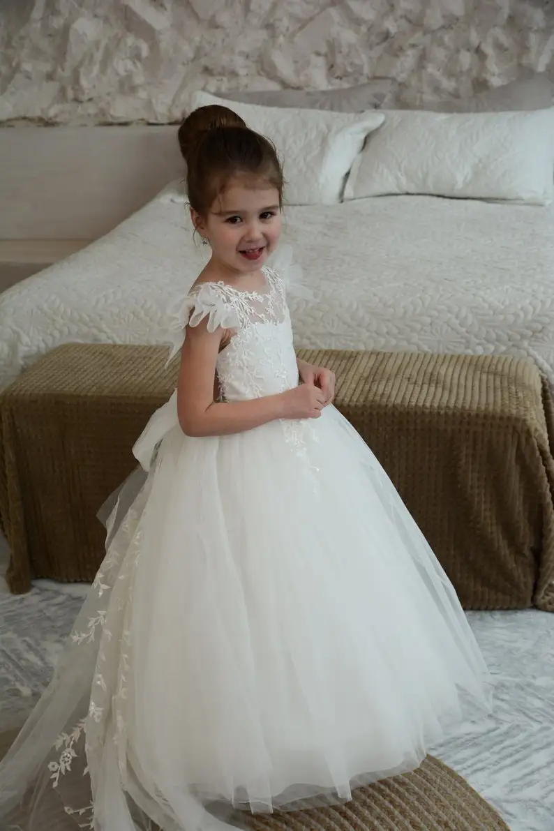 Elfenbeinfarbenes Blumenmädchenkleid, Ballkleid für Kleinkinder, Tutu, Erstkommunionkleider für Kinder, Festzugskleider für Mädchen, Prinzessinnen-Applikationen