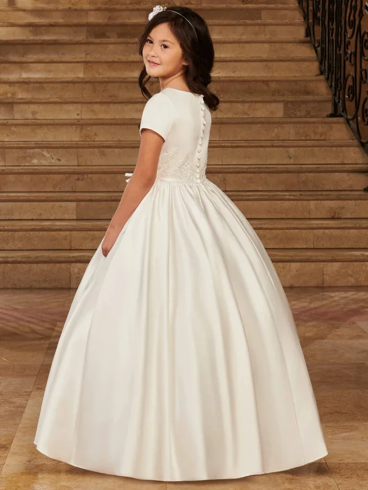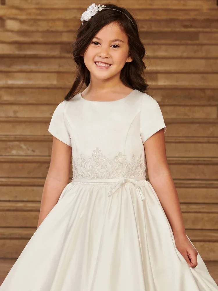 Elfenbein Satin Flory Stickerei Mit Bogen Gürtel Kurzarm Für Hochzeit Geburtstag Party Bankett Prinzessin Kleider Blume Mädchen Kleider