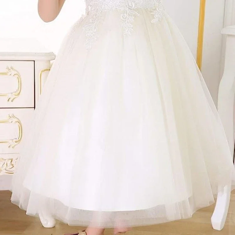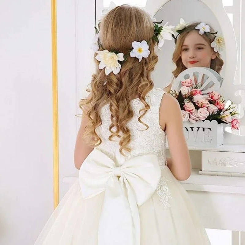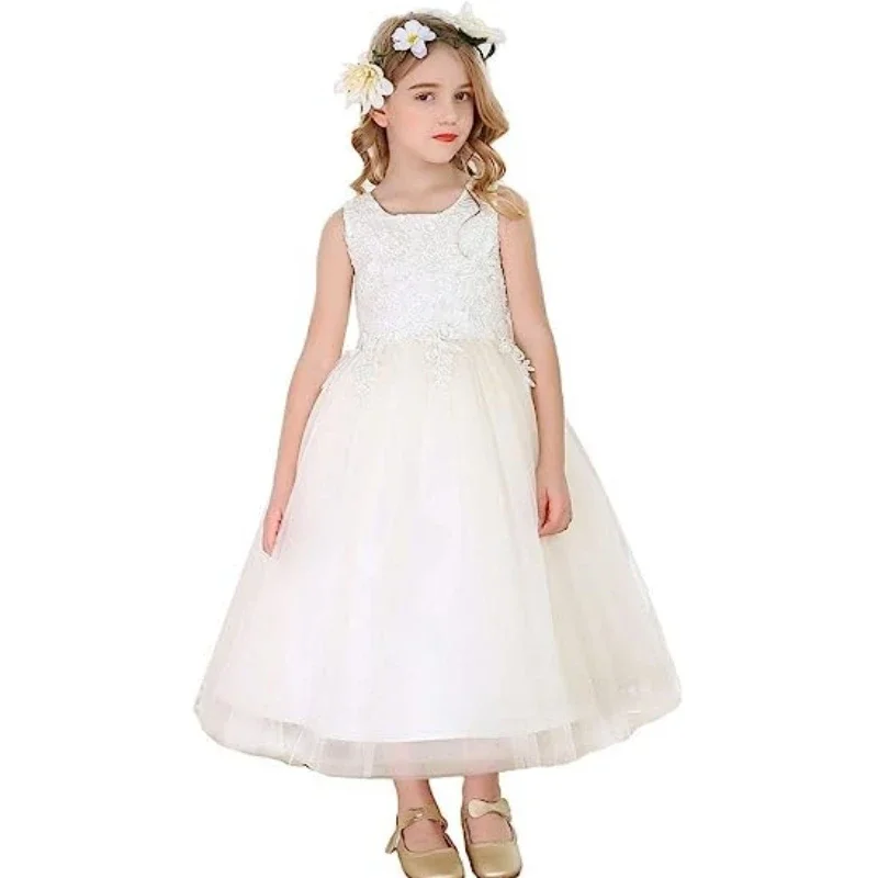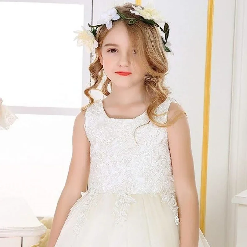 Elfenbeinfarbener Tüll mit bauschiger Applikation und großer Schleife, ärmellos, für Hochzeit, Geburtstag, Bankett, Erstkommunion, Blumenmädchenkleider