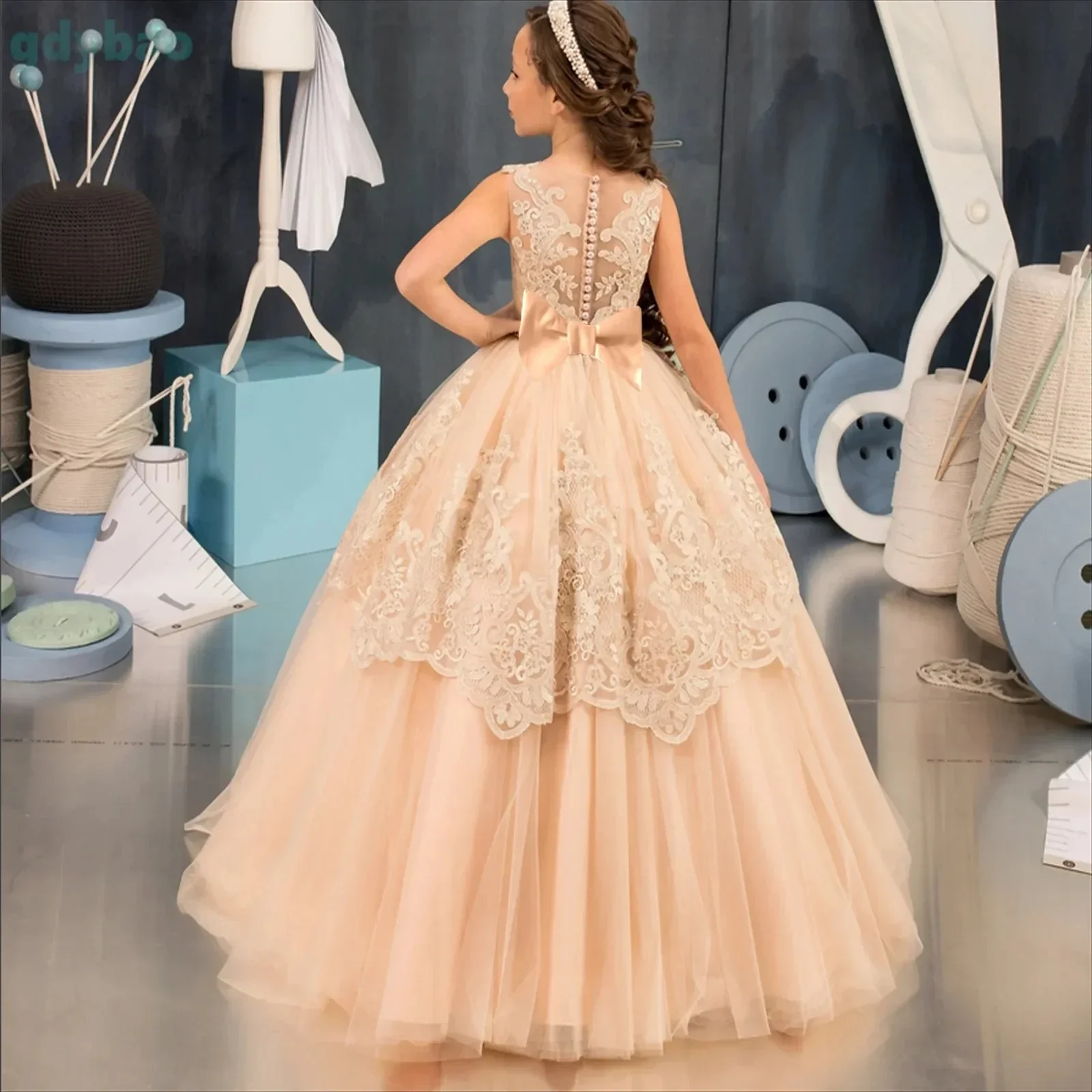 Spitzenapplikationen Bodenlangen Mädchen Kindergeburtstagsfeier Erstkommunion Kleid Maßgeschneiderte Blumenmädchenkleider für die Hochzeit