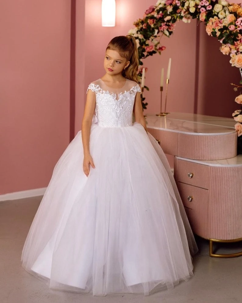 Sorgen Sie dafür, dass sich Ihr Kind einzigartig fühlt mit unserem bezaubernden Blumenmädchenkleid – ideal für jeden besonderen Anlass. Das Kleid besticht durch ein wunderschönes Spitzenmieder und einen elegant fließenden Tüllrock. Auf der Rückseite ergänzt eine große Satinschleife eine lange Knopfleiste. Aufwendige Spitzenakzente auf transparentem Netzstoff sorgen für einen raffinierten Look. Dieses ärmellose Kleid besticht durch einen stilvollen und modernen Look. Die Spitzenverzierungen unterstreichen seine Eleganz. Für noch mehr Charme können Sie eine abnehmbare Schleppe aus Tüll oder Spitze wählen. Perfekt für Hochzeiten, Geburtstage oder andere besondere Anlässe – in diesem Kleid fühlt sich Ihr Kind wie eine Königin.