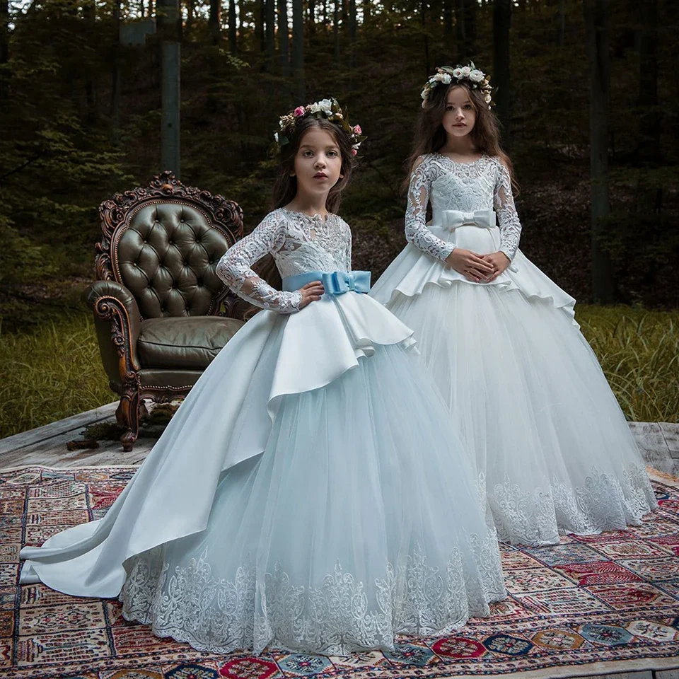 Lange Ärmel Kinder Erstkommunion Kleid Kind Festzug Anpassen Feier O-Ausschnitt Blumenmädchen Kleider Applikationen für Hochzeiten