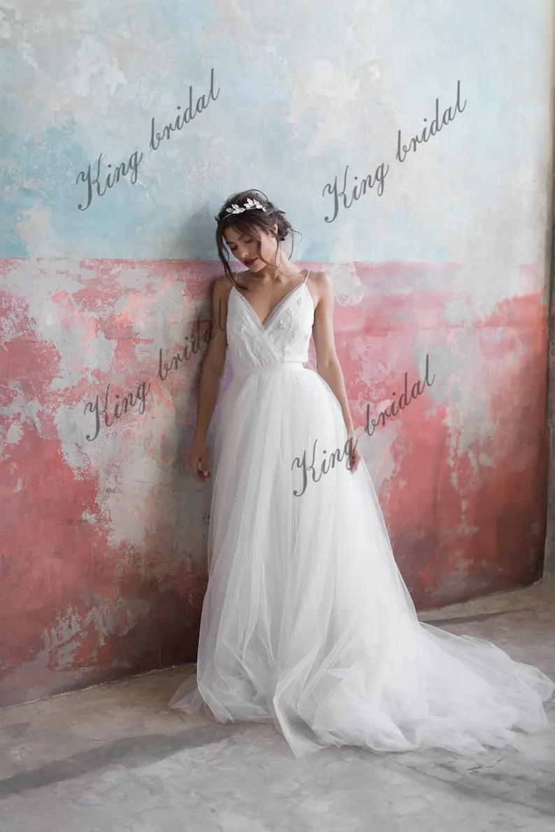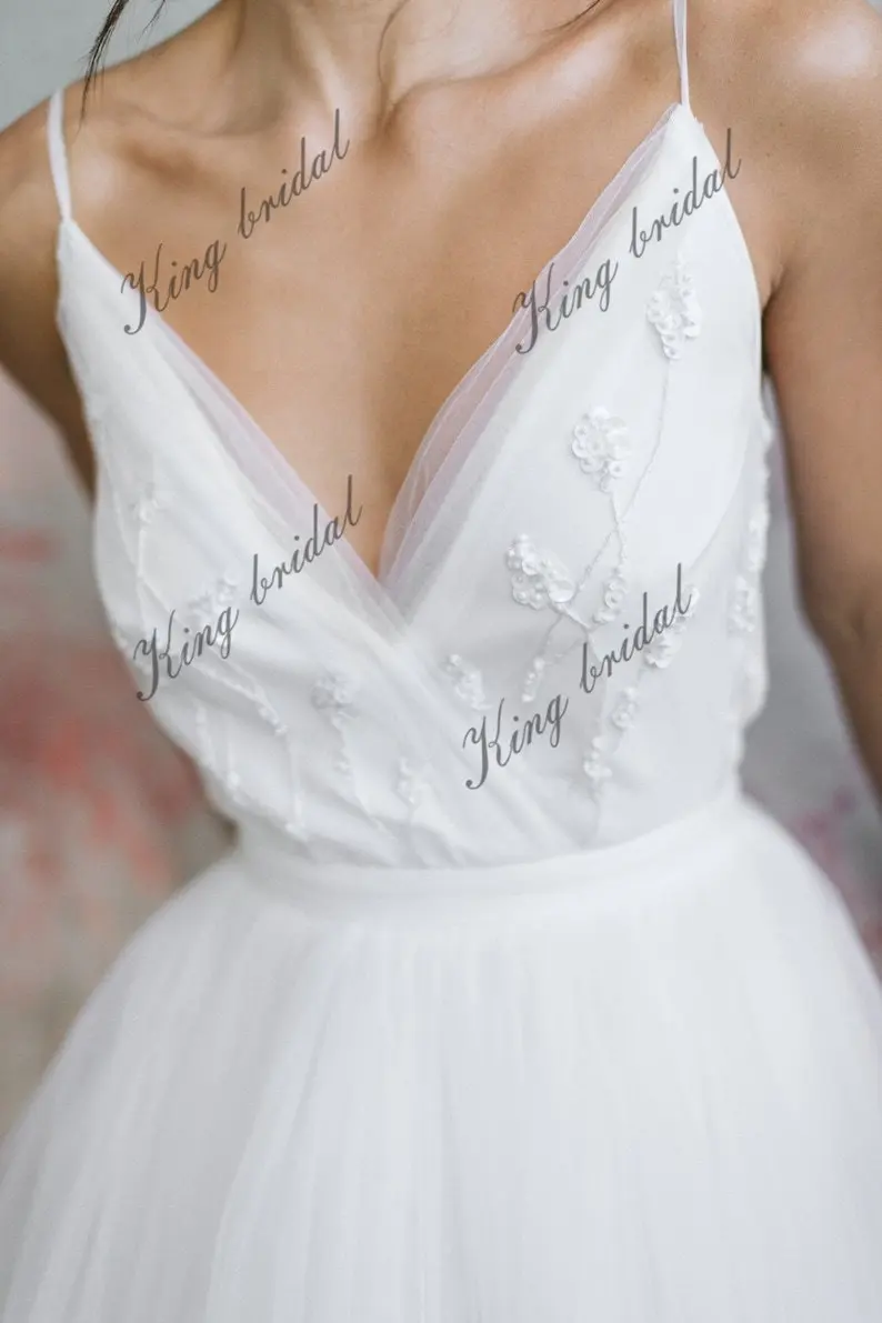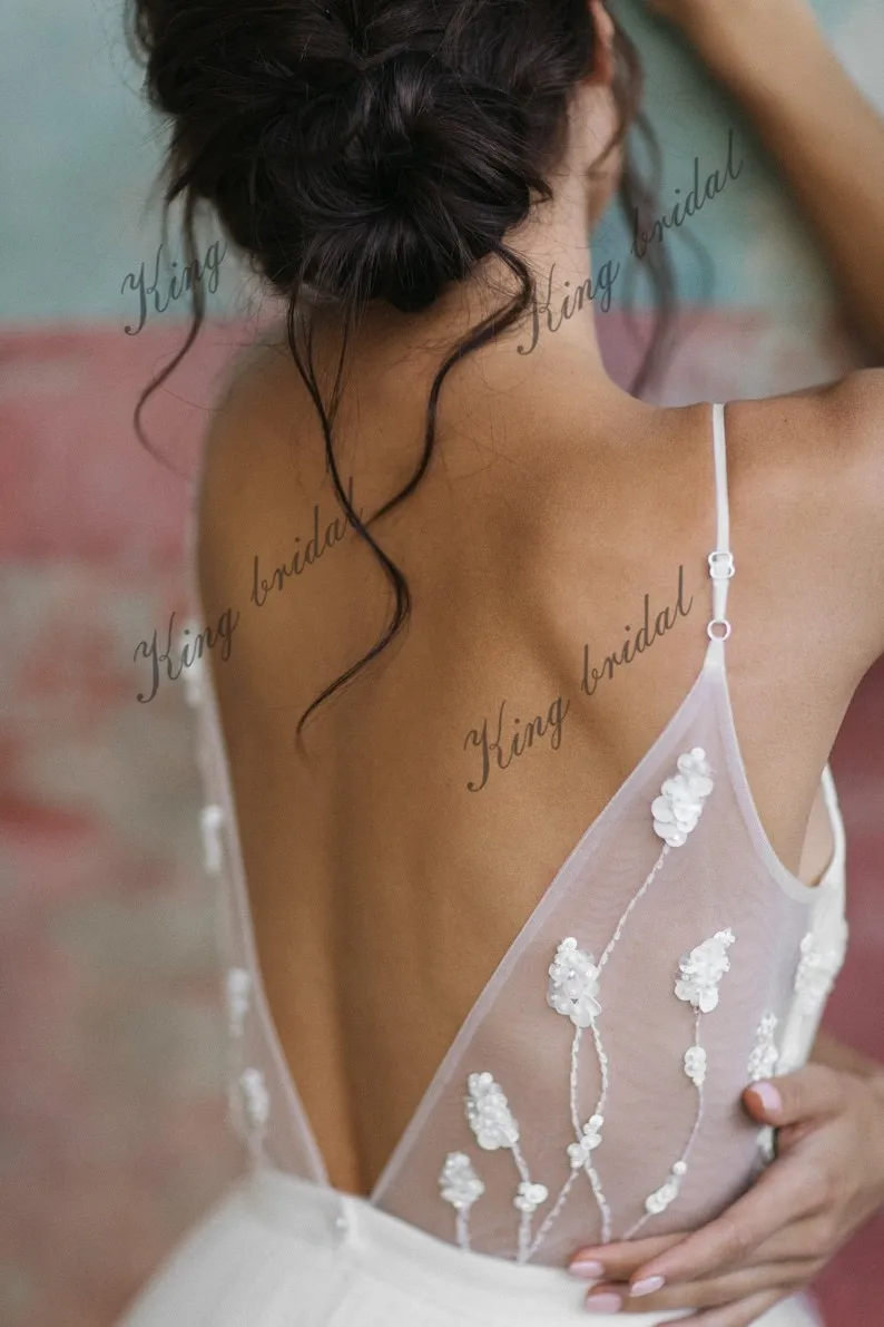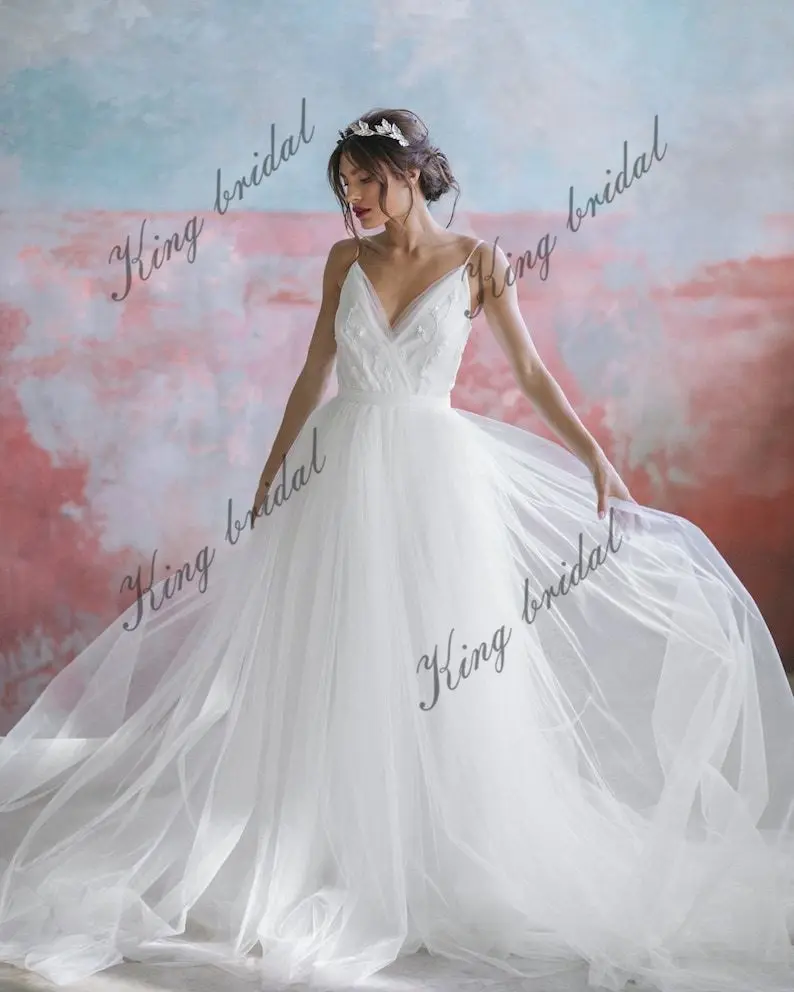 Unser A-Linien-Brautkleid ist mit einer einzigartigen handgefertigten Stickerei verziert. Dieses Meisterwerk besticht durch exquisite Blumenfragmente aus Stickgarn, Perlen und Pailletten, die Vorder- und Rückseite des Oberteils kunstvoll verzieren. Der bezaubernde V-Ausschnitt auf der Vorderseite ist elegant mit drapiertem Tüll verziert und verleiht ihm einen Hauch von Romantik und Raffinesse. Verstellbare Spaghettiträger sorgen für einen bequemen und individuellen Sitz. Der Rock fällt anmutig mit einer langen Schleppe aus mehreren Lagen luxuriöser Seide und Tüll und erzeugt einen atemberaubenden und luftigen Effekt beim Gang zum Altar. Für Ihren Komfort wird das Kleid auf der Rückseite diskret mit einem verdeckten Reißverschluss verschlossen.