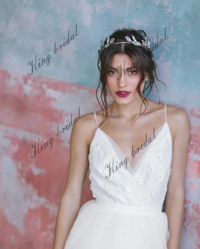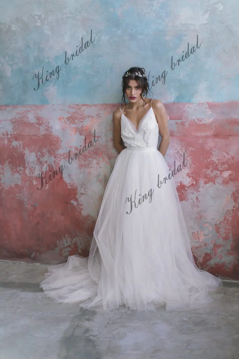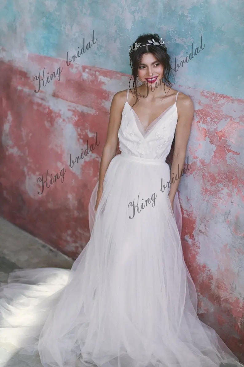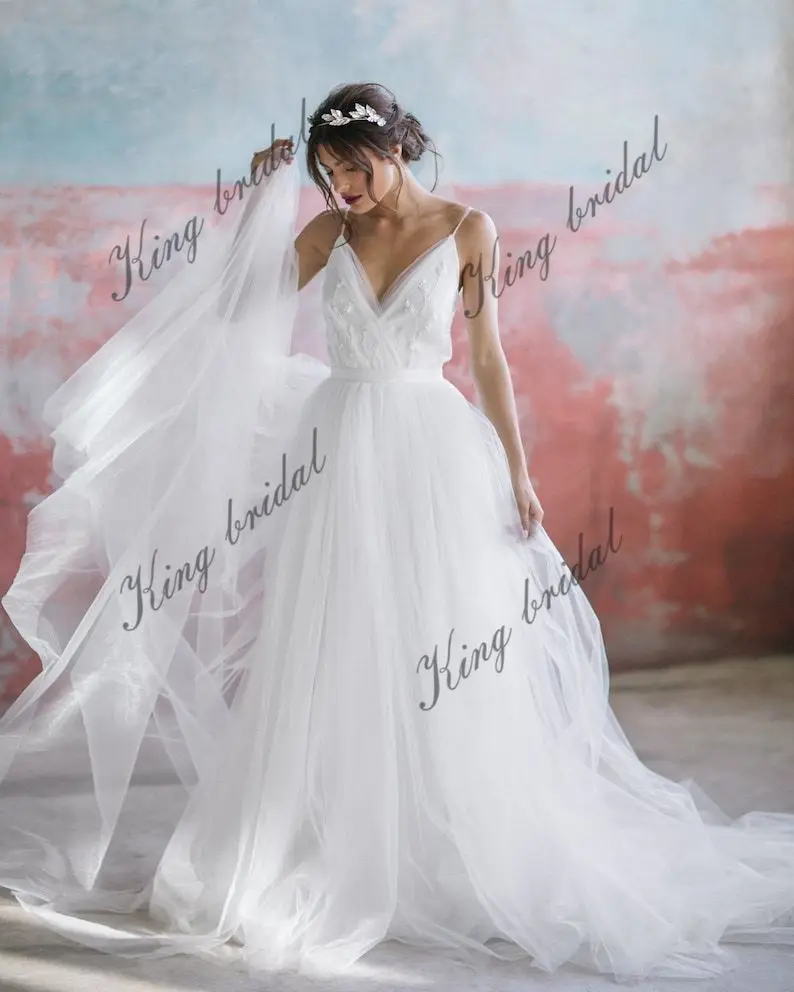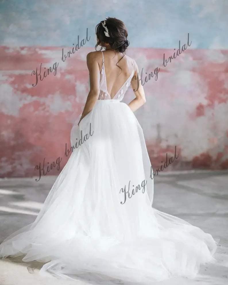 Unser A-Linien-Brautkleid ist mit einer einzigartigen handgefertigten Stickerei verziert. Dieses Meisterwerk besticht durch exquisite Blumenfragmente aus Stickgarn, Perlen und Pailletten, die Vorder- und Rückseite des Oberteils kunstvoll verzieren. Der bezaubernde V-Ausschnitt auf der Vorderseite ist elegant mit drapiertem Tüll verziert und verleiht ihm einen Hauch von Romantik und Raffinesse. Verstellbare Spaghettiträger sorgen für einen bequemen und individuellen Sitz. Der Rock fällt anmutig mit einer langen Schleppe aus mehreren Lagen luxuriöser Seide und Tüll und erzeugt einen atemberaubenden und luftigen Effekt beim Gang zum Altar. Für Ihren Komfort wird das Kleid auf der Rückseite diskret mit einem verdeckten Reißverschluss verschlossen.