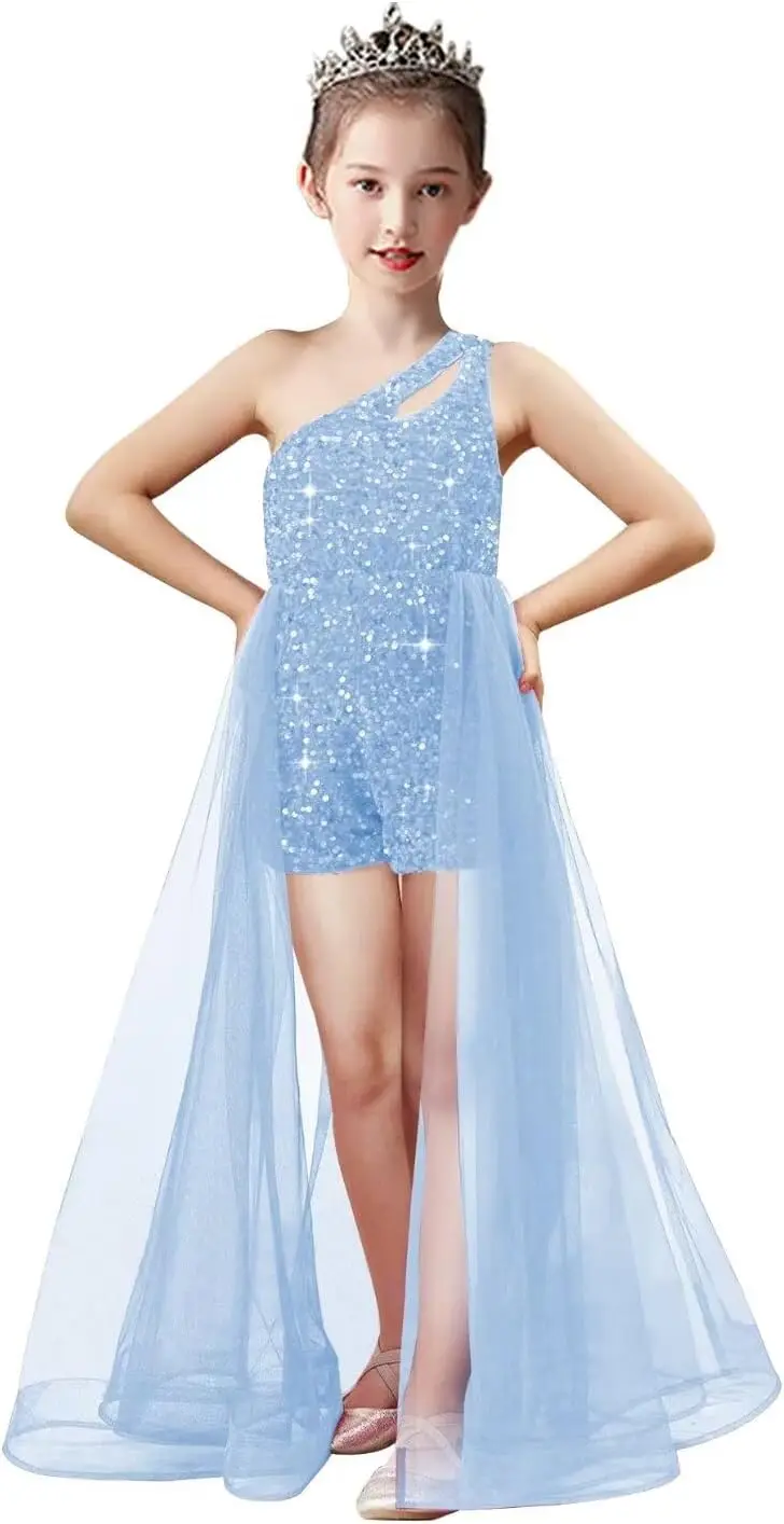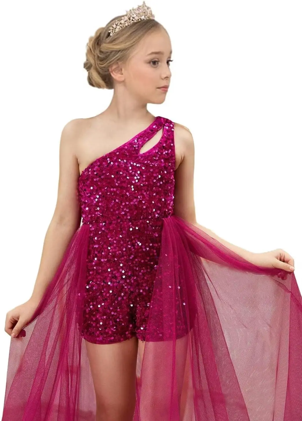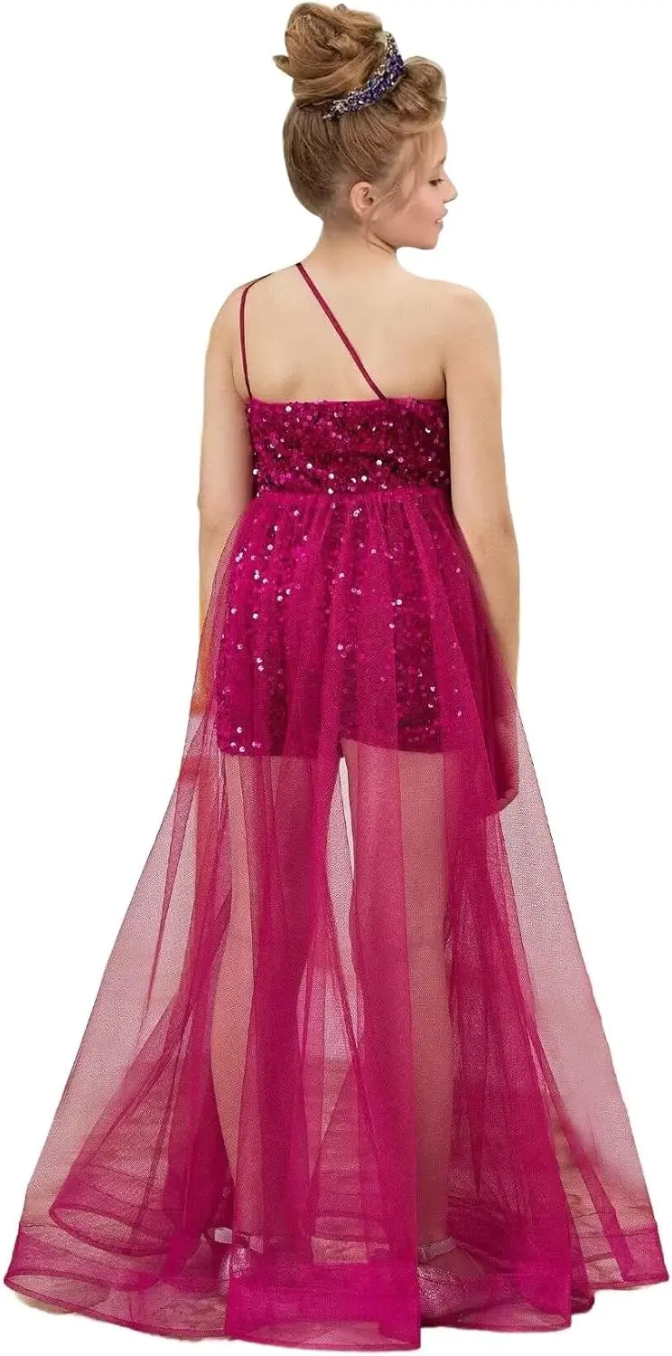 Einschultriges Festzugskleid, Jumpsuits, Blumenmädchenkleid, Pailletten-Mädchen-Ballkleider, Tüll-Strampler, Maxikleid mit Cape, Partykleider