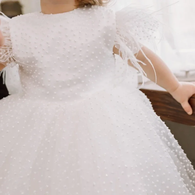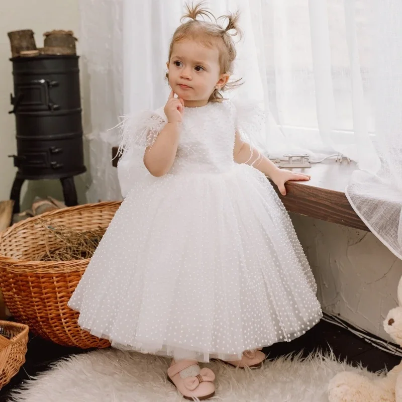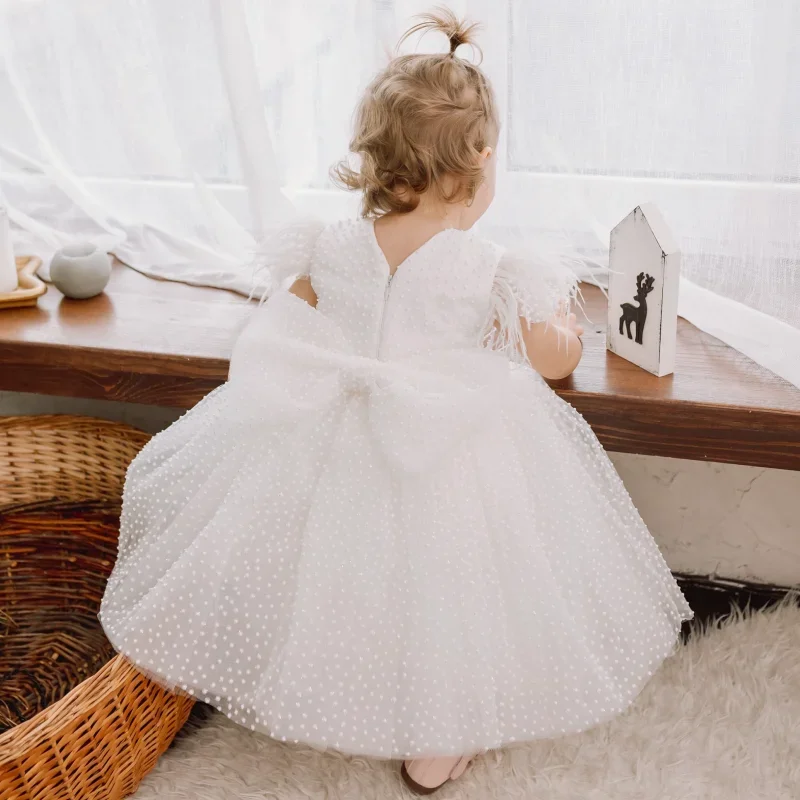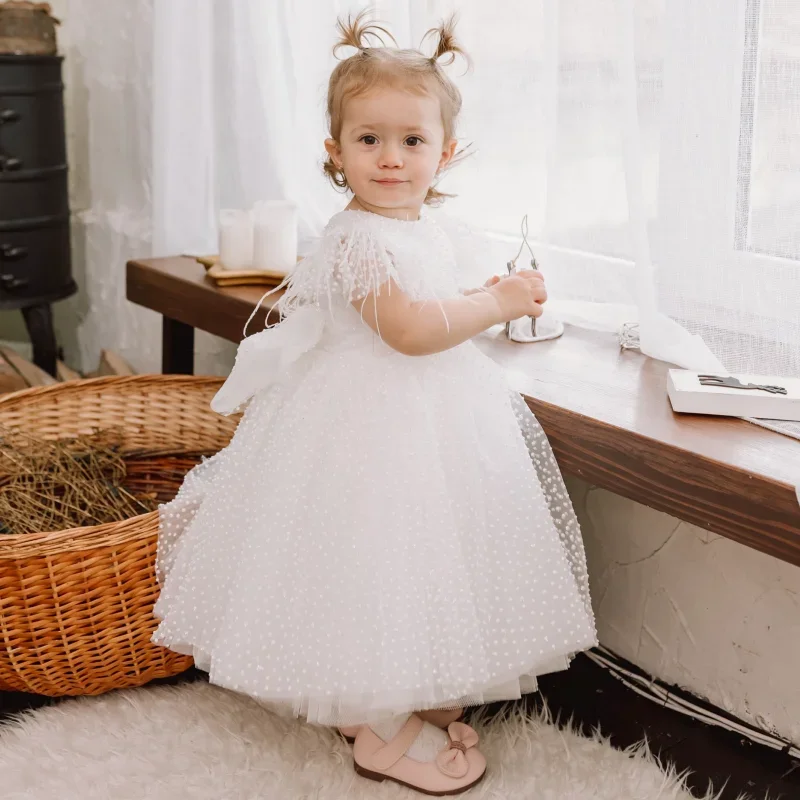 Party Geburtstag Heilige Kommunion Kleider Blumenmädchenkleider Weißer Tüll Wave Point Rock mit Schleife Federärmel für Hochzeit