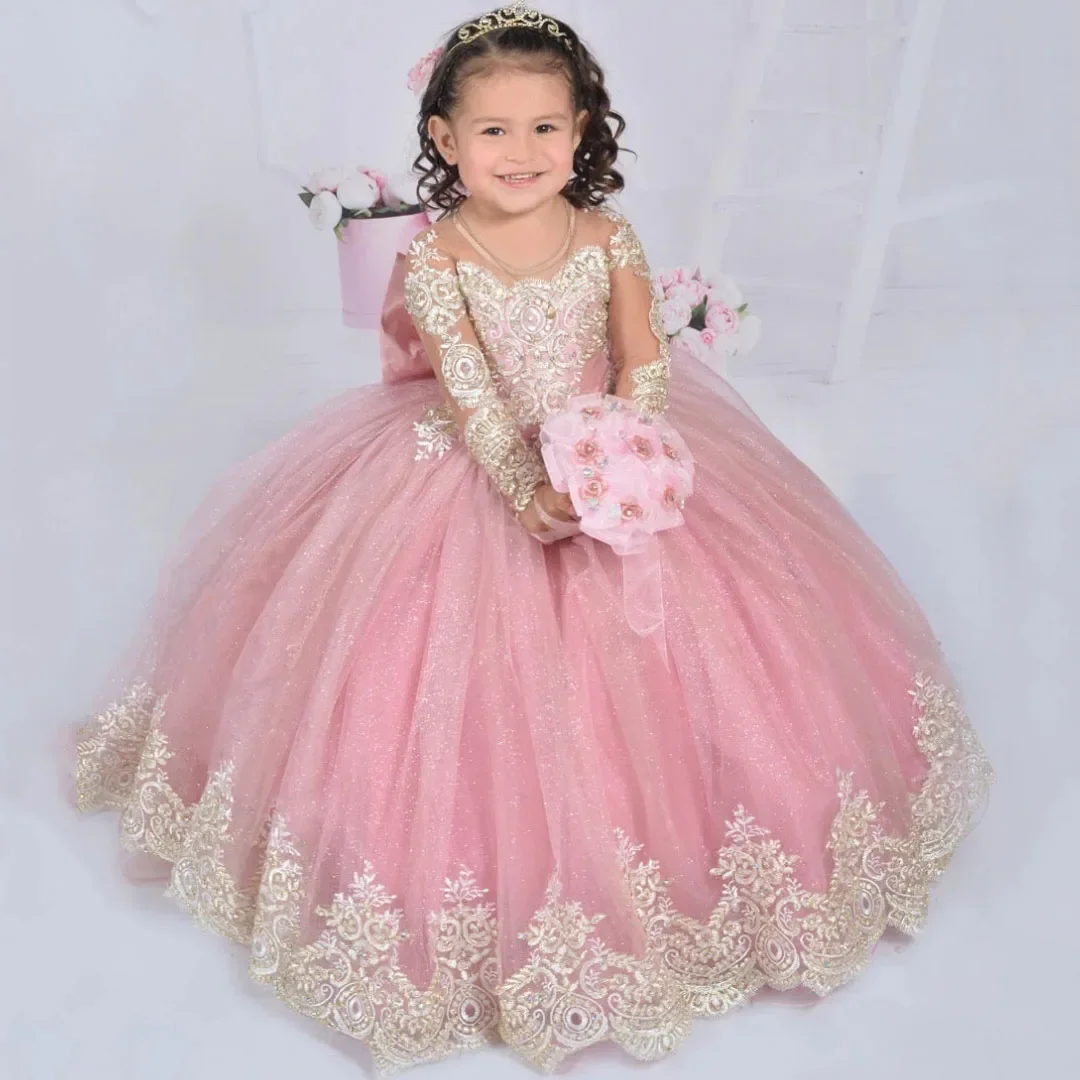 Rosa Gold Flory Applikationen mit Schleife Langarm für Hochzeit Geburtstag Party Heilige Kommunion Kleider individuelle Blumenmädchenkleider