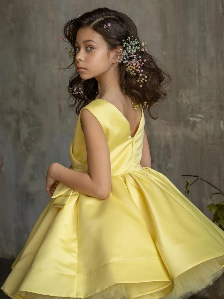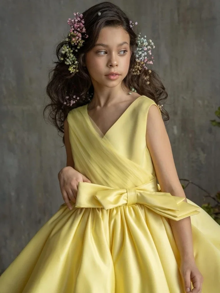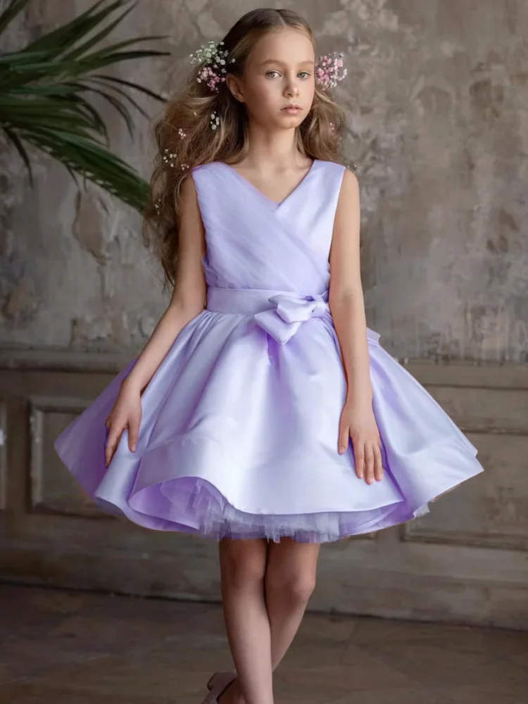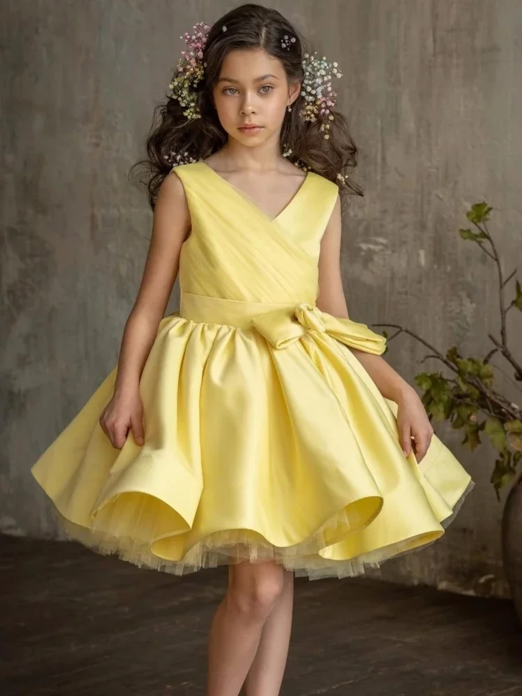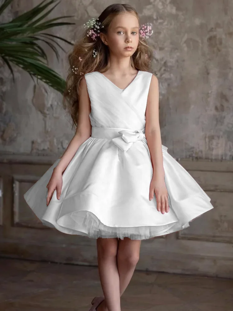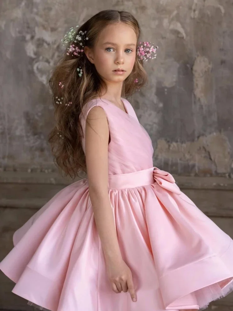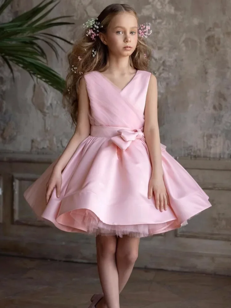 Rosa Tüll Satin mit Schleife ärmellos für Hochzeit Geburtstag Party Bankett Erstkommunion Kleider Blumenmädchenkleider