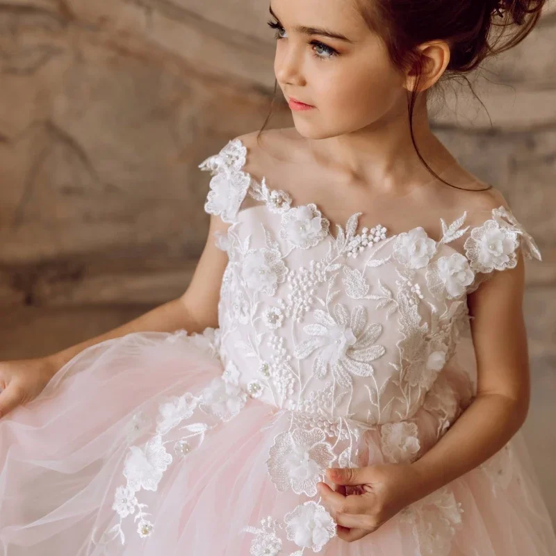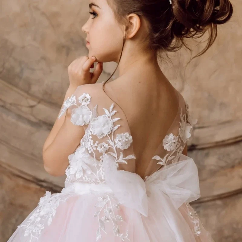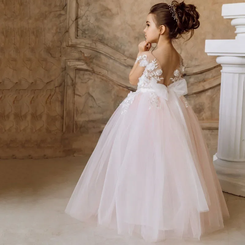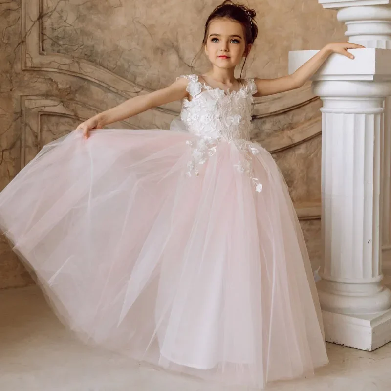 Rosa weiße Blumen Applikationen mit Schleife ärmellos für Hochzeit Geburtstag Party Heilige Kommunion Kleider individuelle Blumenmädchenkleider