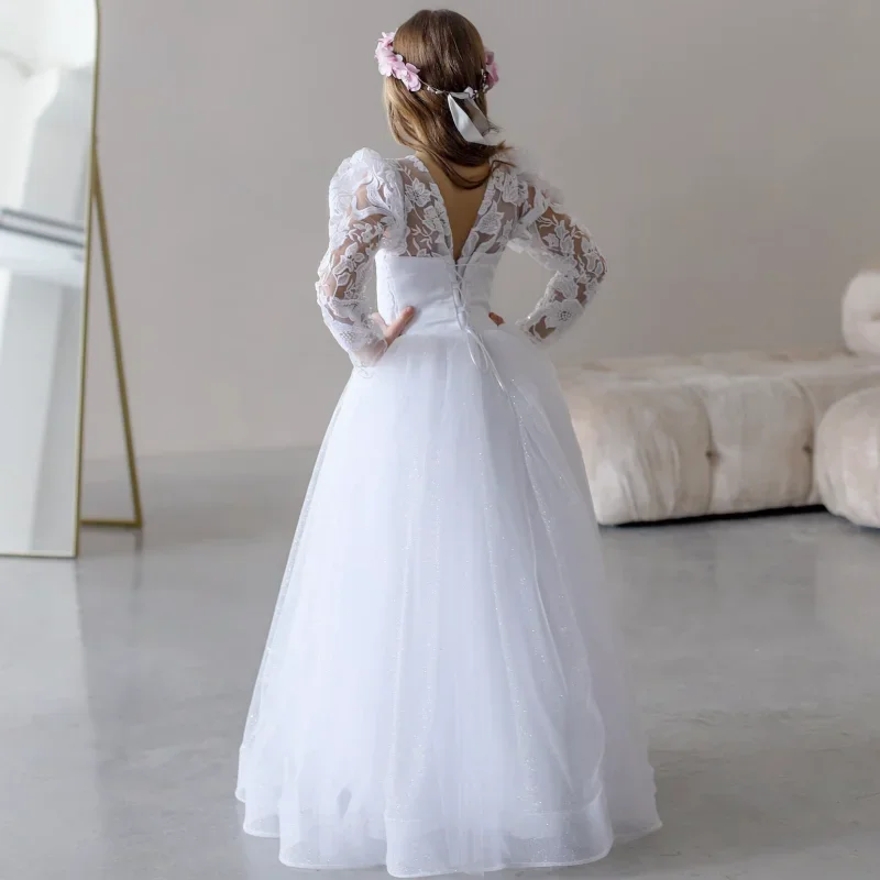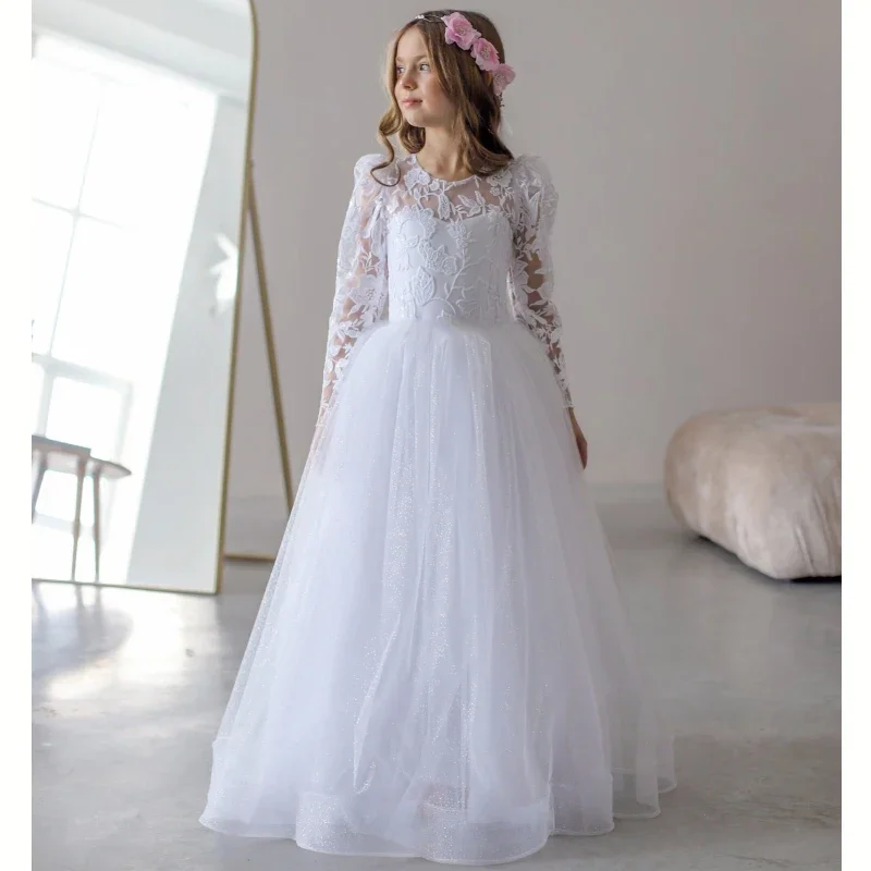 Prinzessin Kleid Blumenmädchenkleider Weiß Tüll Blumen Stickerei Langarm Für Hochzeit Geburtstag Party Erstkommunion Kleider