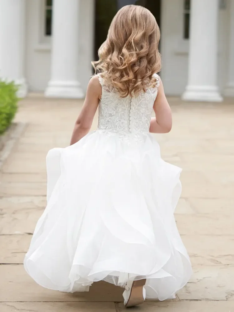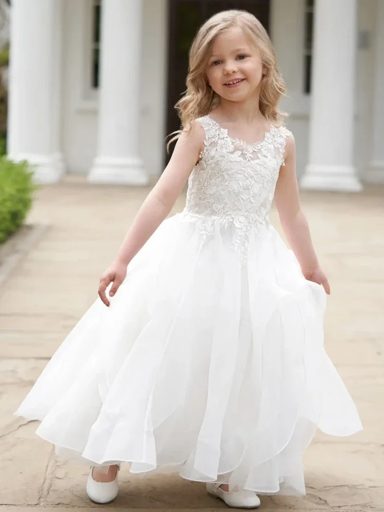 Prinzessinnenkleid Blumenmädchenkleider Weißer Tüll Stufenapplikationen Ärmellos Für Hochzeit Geburtstagsfeier Erstkommunionkleider