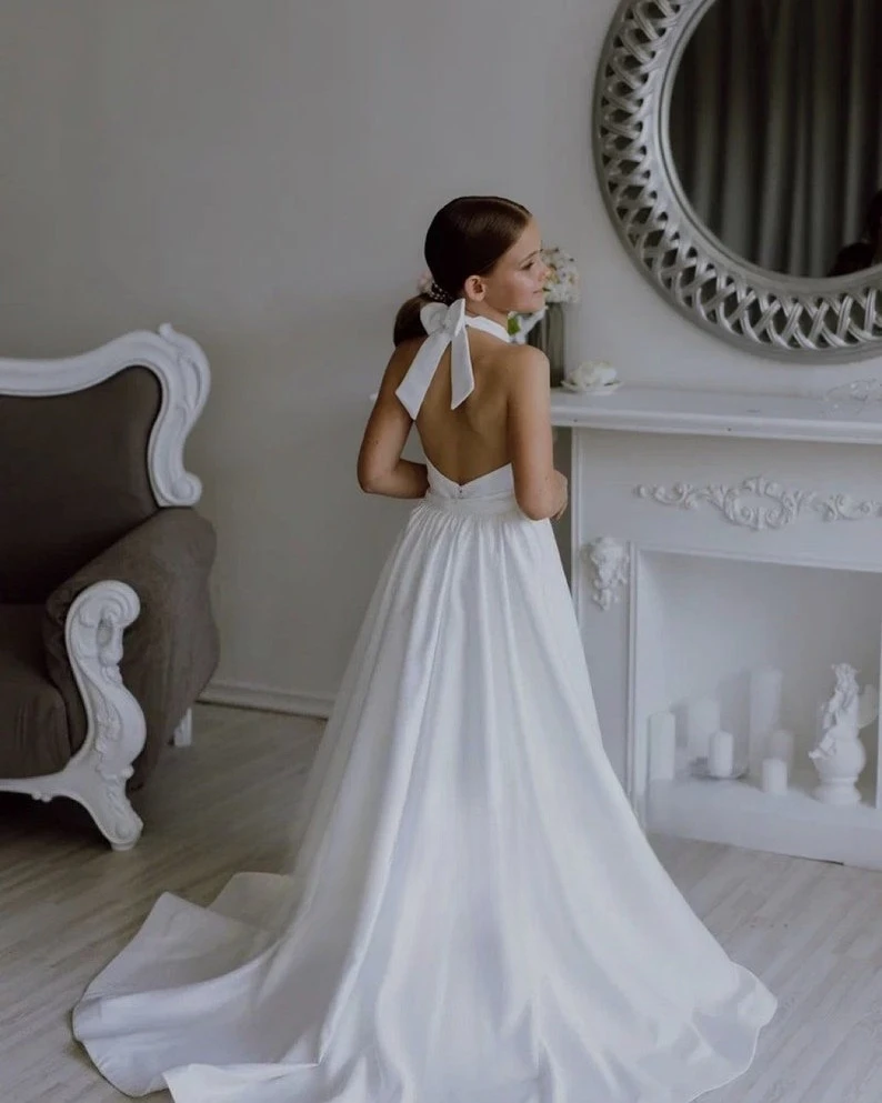 Dieses wunderschöne Kleid ist aus hochwertigem Satin gefertigt. Das Hauptmerkmal des Kleides ist der Neckholder-Ausschnitt mit einer bezaubernden Schleife im Nacken. Der offene Rücken unterstreicht die Eleganz des Looks.