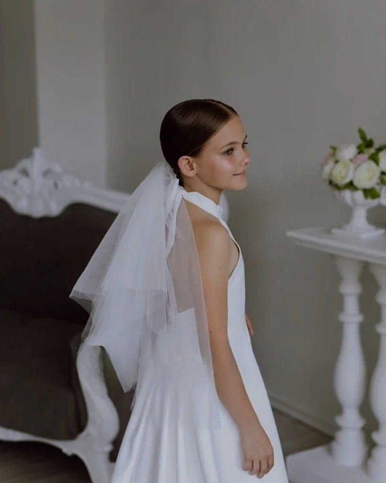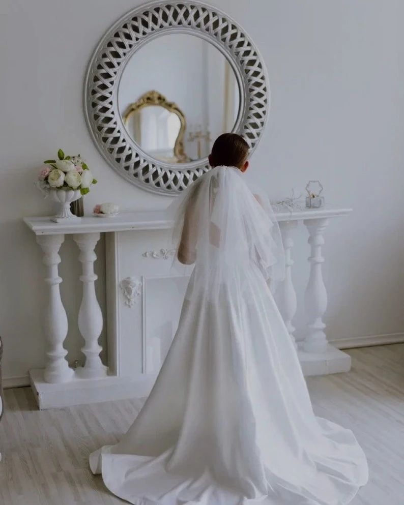 Das Kleid kann auf Wunsch mit einer langen abnehmbaren Schleppe ergänzt werden. Es stehen zwei Schleppen zur Verfügung: eine mehrlagige Tüllschleppe und eine Satinschleppe. Die Schleppen sind mit kleinen Knöpfen am Kleid befestigt und lassen sich leicht abnehmen.