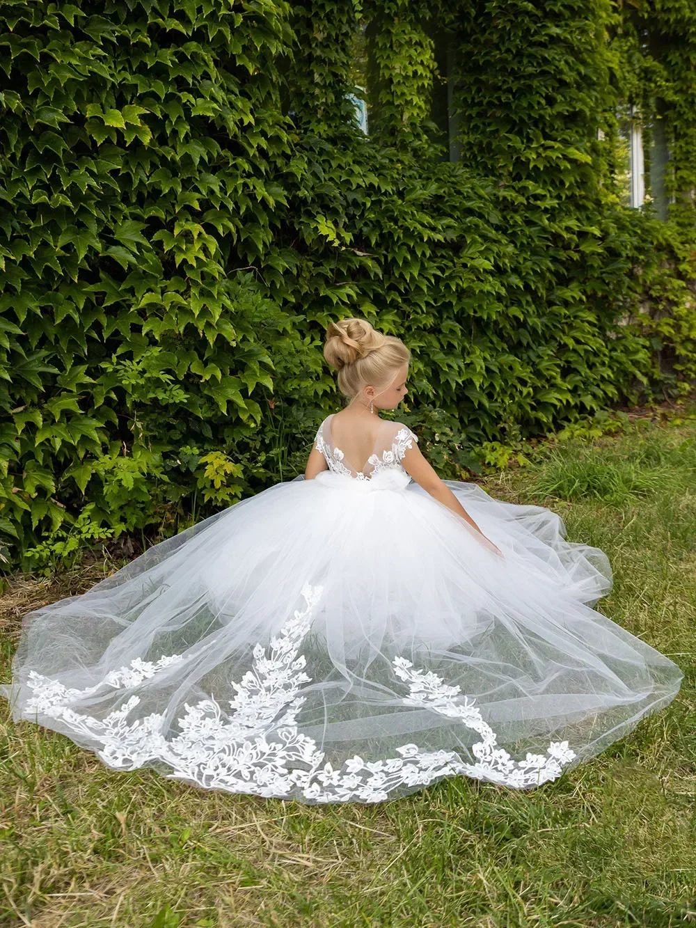 Ärmelloses, elegantes, langes Kommunions-Festzugskleid für kleine Mädchen, individuelles weißes Blumenmädchenkleid für Hochzeitsspitzenapplikationen