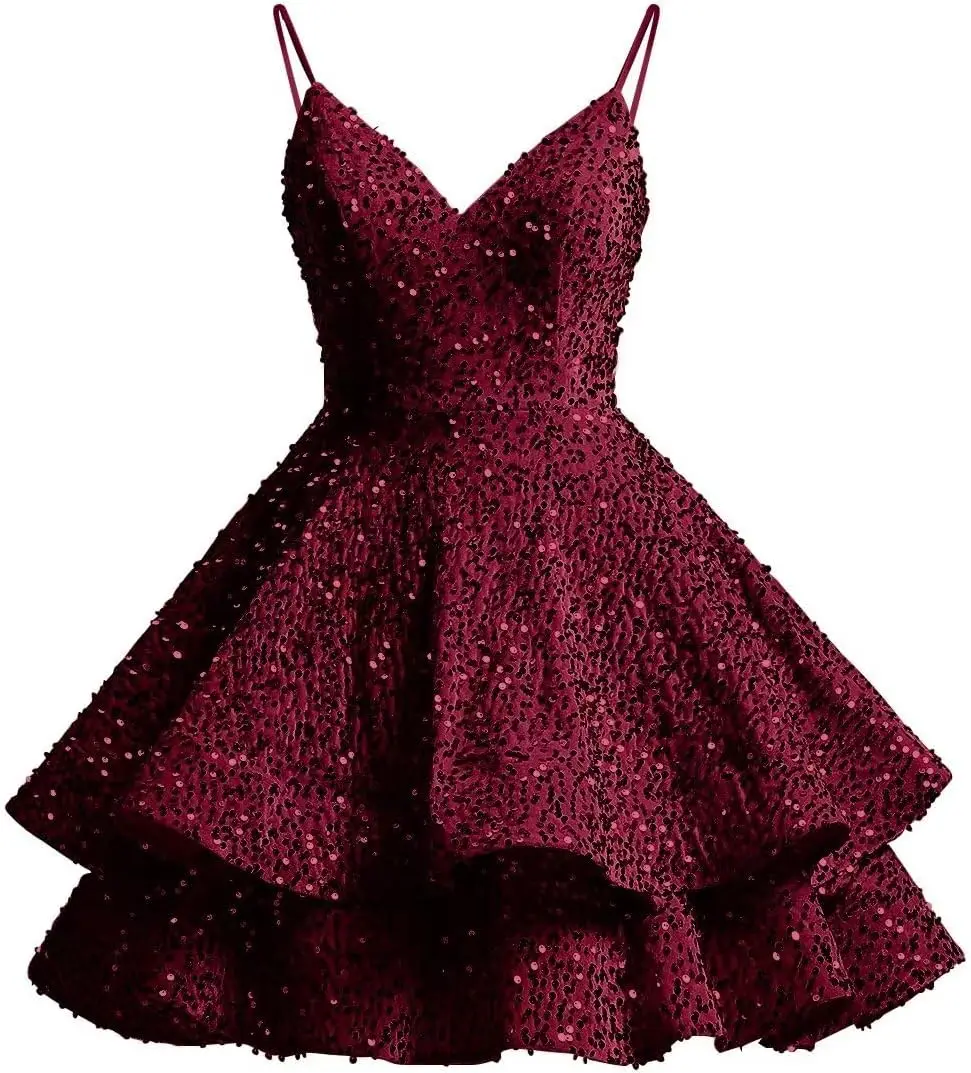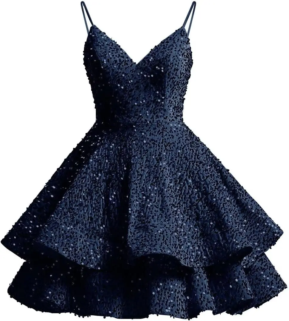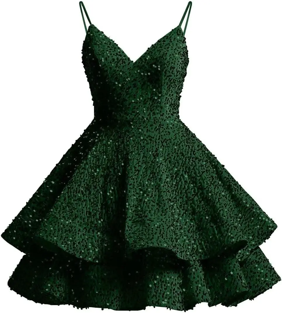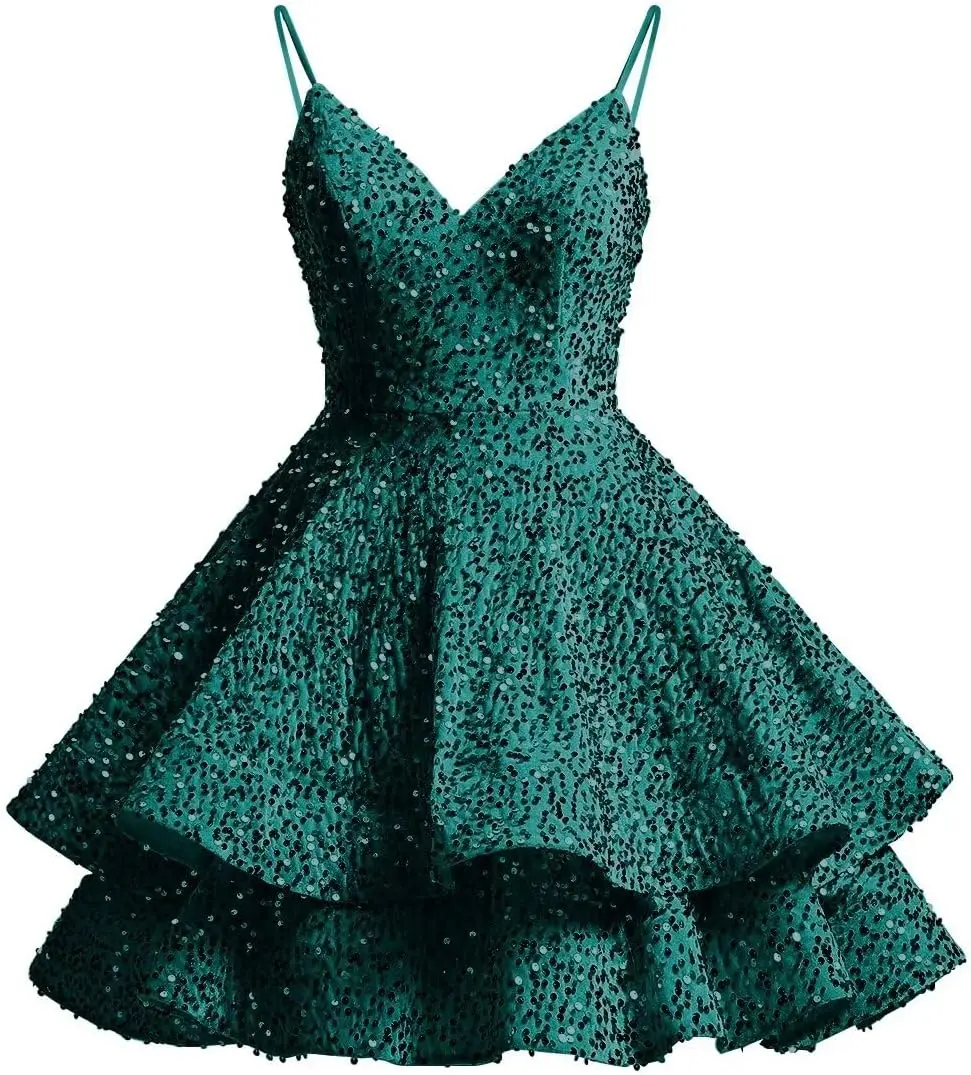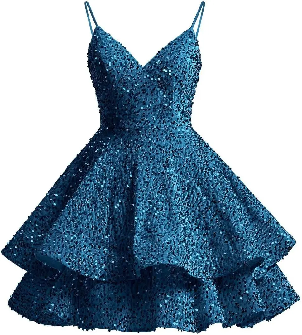 Glitzernde Pailletten-Heimkehrkleider für Teenager 2025, kurzer V-Ausschnitt, A-Linie, gestuftes Mini-Abschlussball-Cocktailkleid über dem Knie, Clubkleid