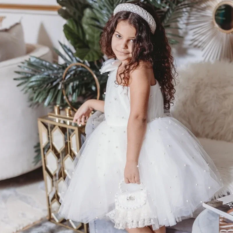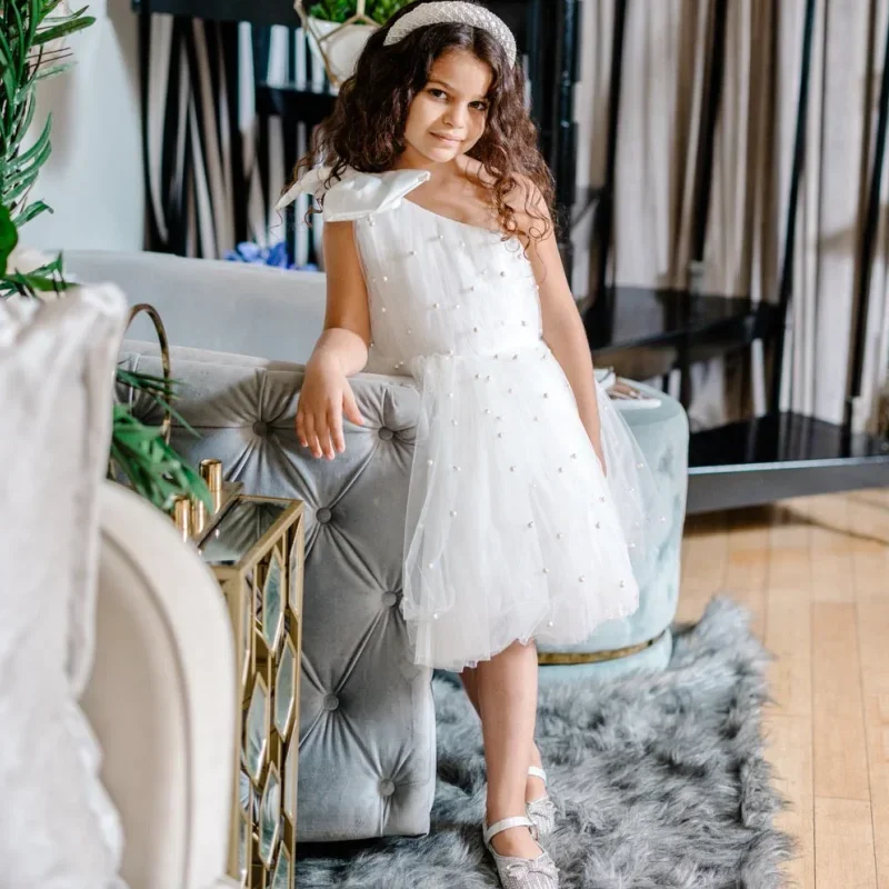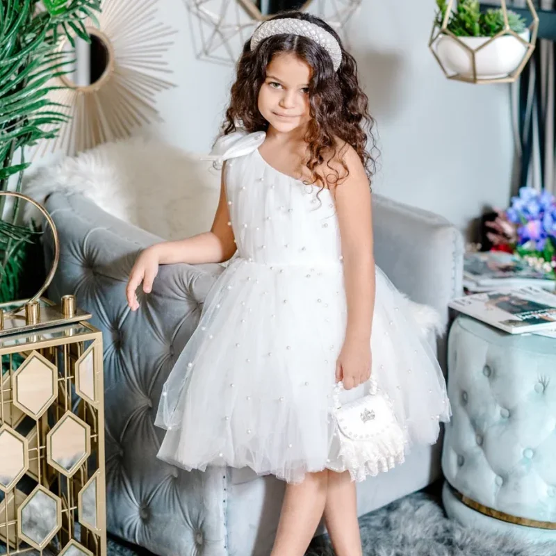 Tüllperlenrock mit Schleife, einzelne Schulter, ärmellos, für Hochzeit, Geburtstag, Erstkommunion, weiße Blumenmädchenkleider