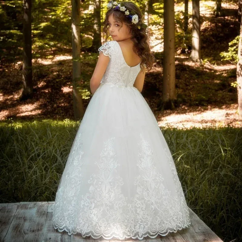 Tüll Puffy Spitze Flory Applikationen Kurzarm Für Hochzeit Geburtstag Party Bankett Prinzessin Kleider Blumenmädchenkleider Weiß