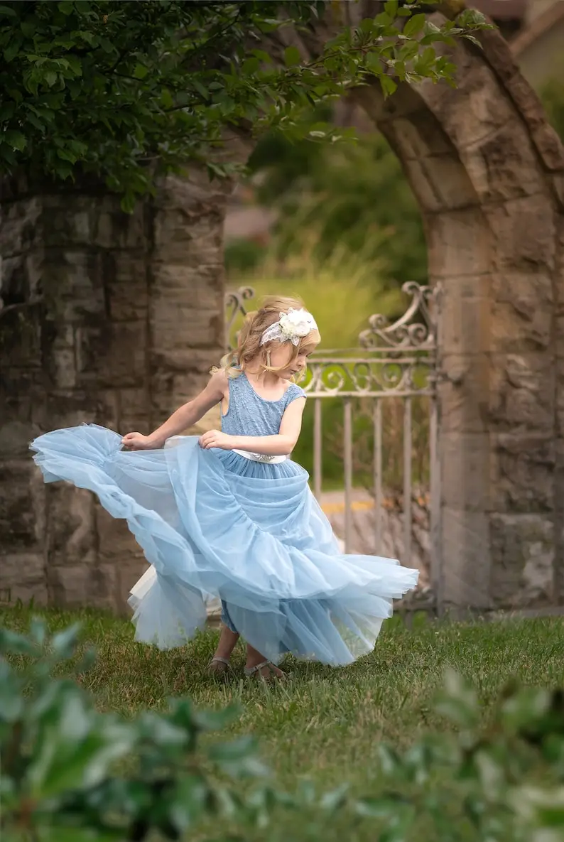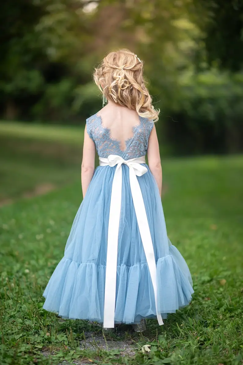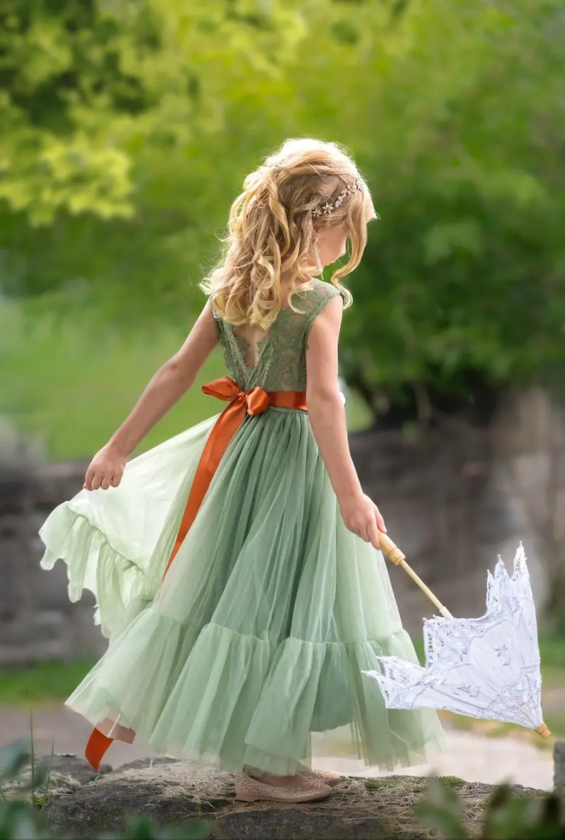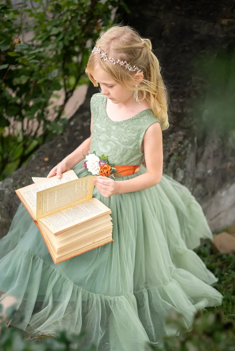 Tüll rustikales Spitzenkleid für Blumenmädchen, ärmellose Blumenmädchenkleider, Boho Blumenmädchenkleid, Salbeigrünes Prinzessinnenkleid