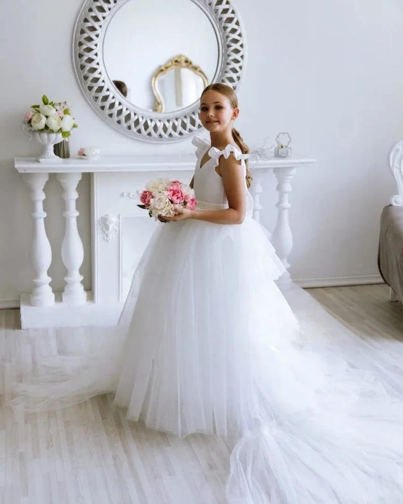Rustikales Blumenmädchenkleid mit bezaubernden kleinen Rüschenärmeln. Das Oberteil besteht aus Satin, der Rock aus Tüll. Die Satinschleife am Rücken ist abnehmbar. Sie können Ihr Kleid auch mit einer Tüllschleppe ergänzen. Es sind zwei Schleppenvarianten erhältlich. Beide sind abnehmbar und können jederzeit leicht entfernt werden.
