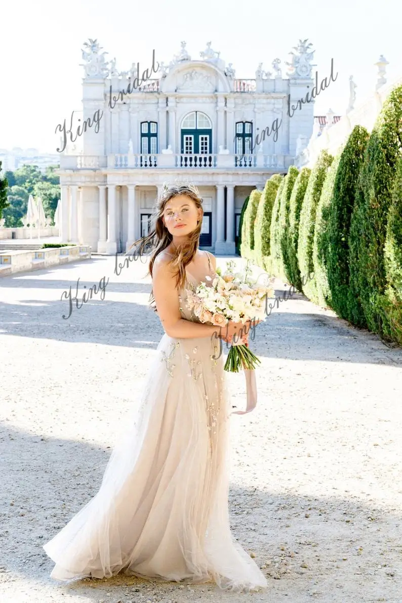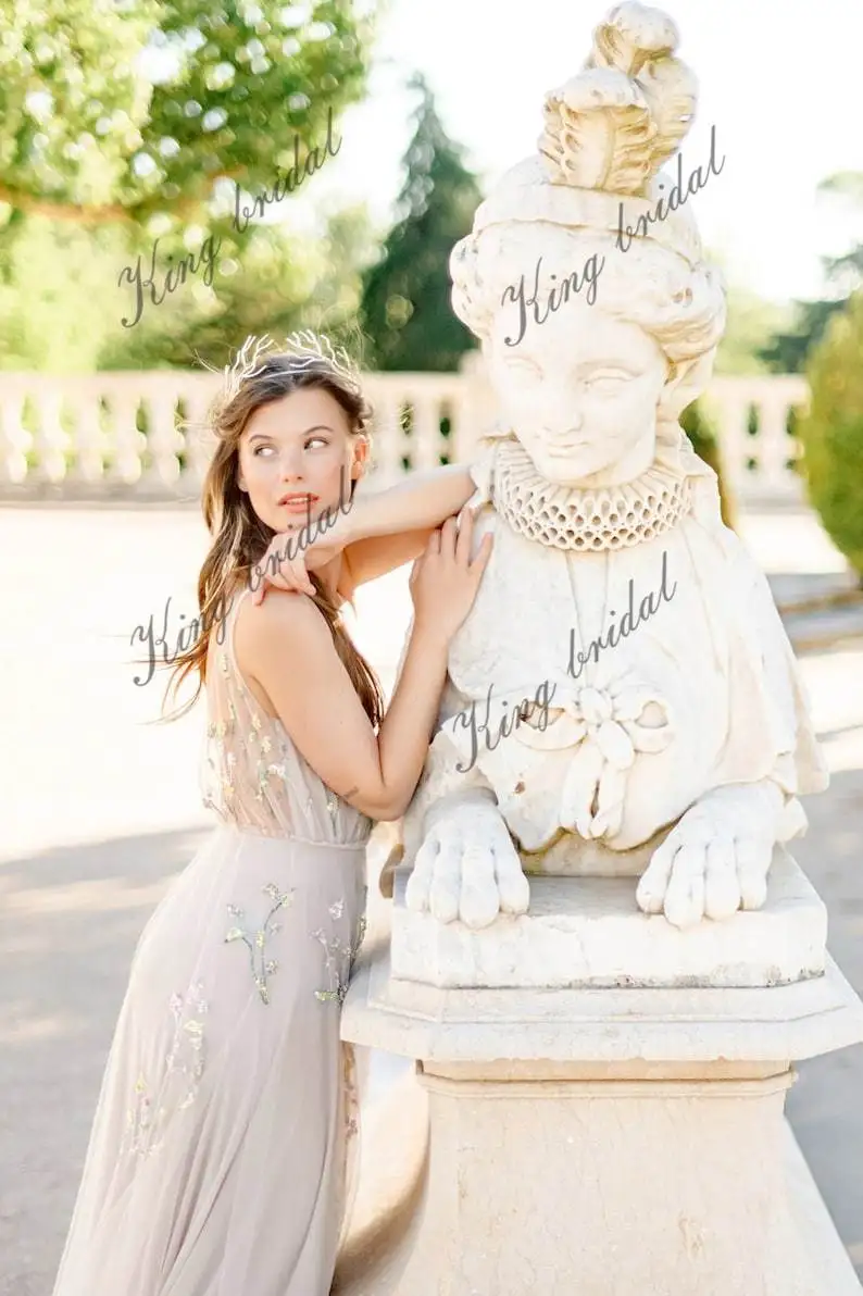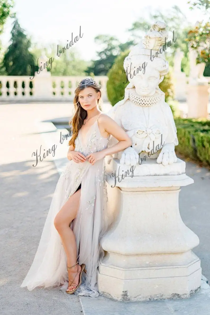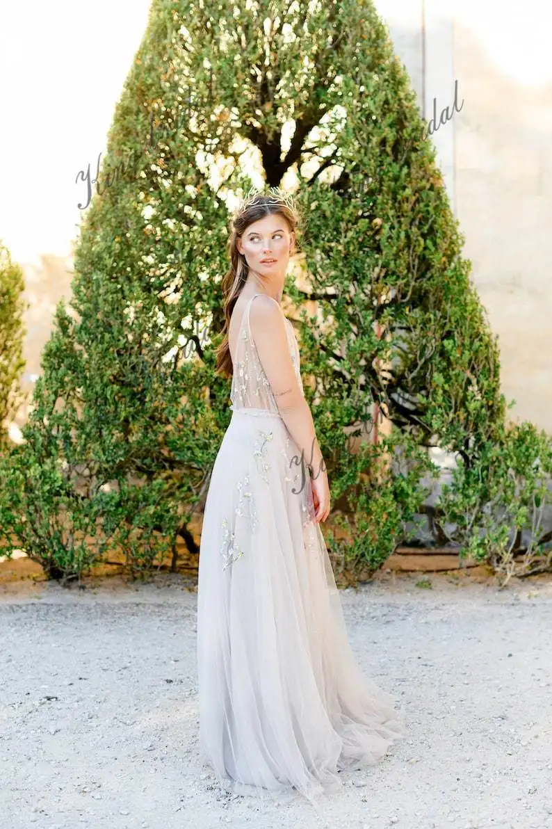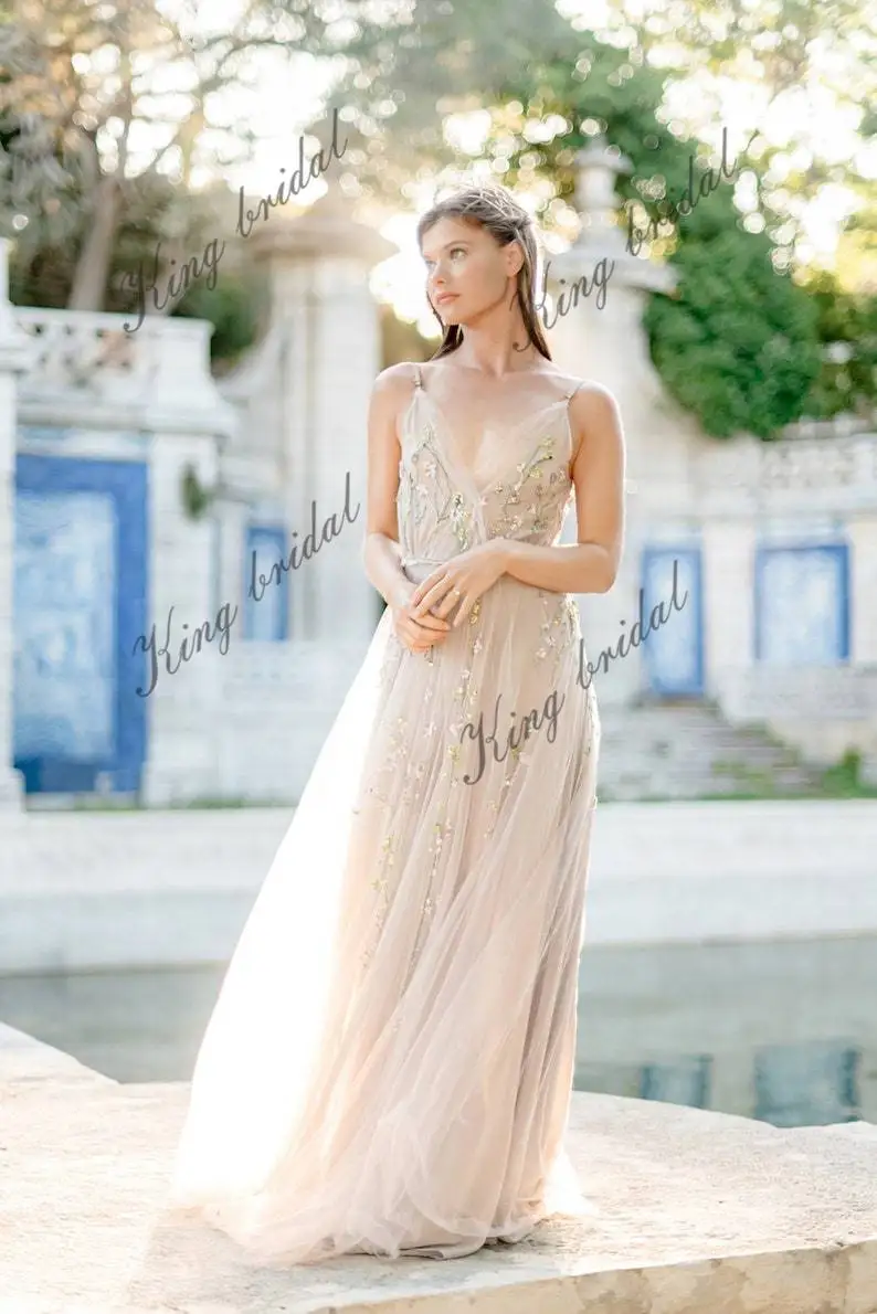 Unser Brautkleid in kühlem Beige und Sand hat einen tiefen V-Ausschnitt, der Ihr Dekolleté elegant betont. Das gesamte Kleid ist mit handgefertigten, mehrfarbigen Stickereien verziert. Der vordere V-Ausschnitt wird durch Tülldraping betont, während der transparente Rücken einen tiefen V-Ausschnitt präsentiert. Individuell anpassbare, verstellbare Träger sorgen für Passform und Tragekomfort. Der Rock hat einen Schlitz vorne für fließende Bewegungen und besteht aus mehreren Lagen Crêpe und Tüll, die in sanften Wellen herabfließen. Das Kleid ist mit einem verdeckten Reißverschluss und einem Haken am Rücken versehen.