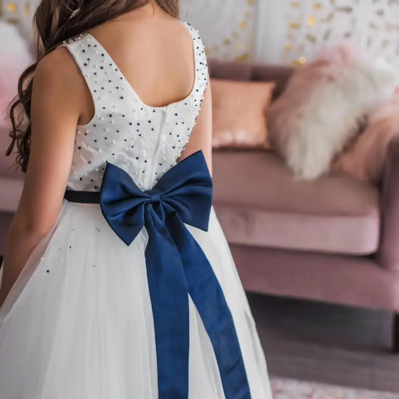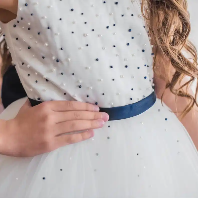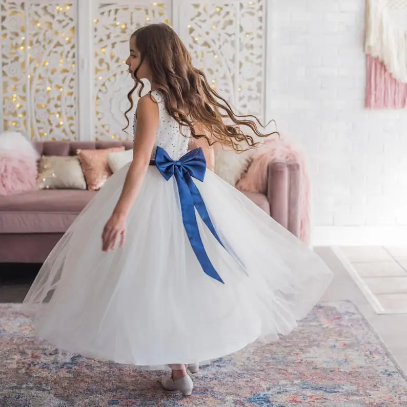 Weißes, marineblaues Blumenmädchenkleid, Geburtstagskleid, marineblaue Perlen, Tüllkleider, knöchellang, für Hochzeiten, Prinzessinnenkleider für Kleinkinder