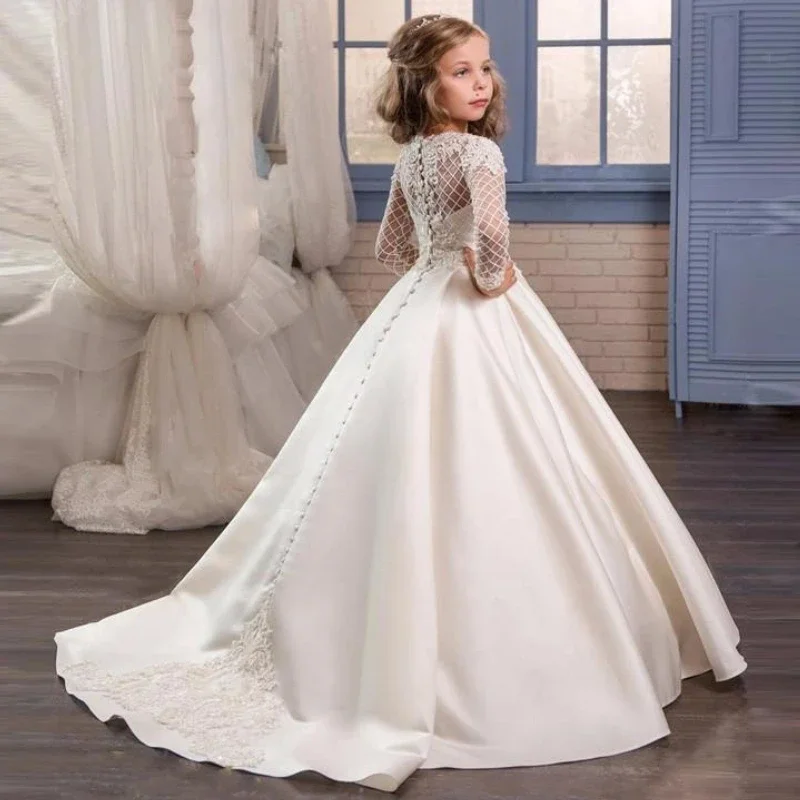 Weiß Satin Applikationen Muster Langarm Für Hochzeit Geburtstag Party Erstkommunion Kleider Blumenmädchenkleider
