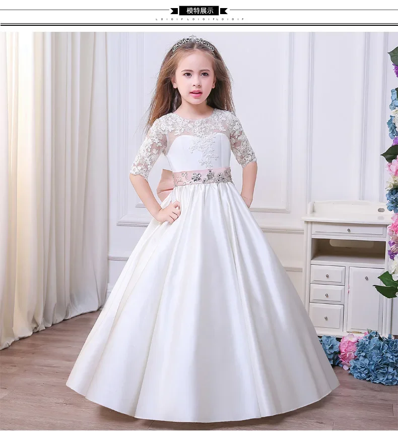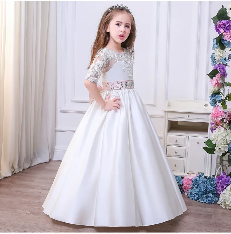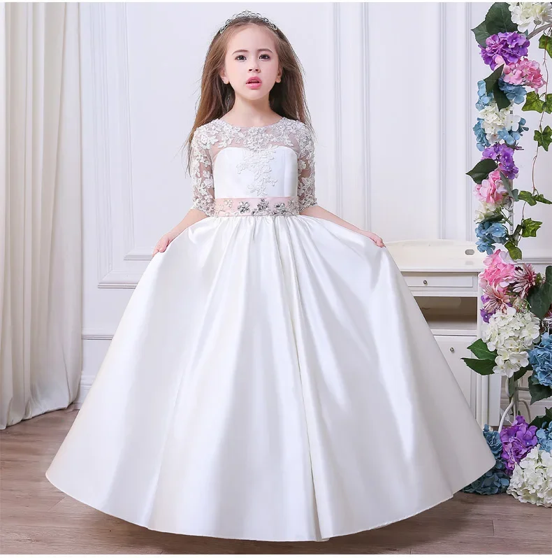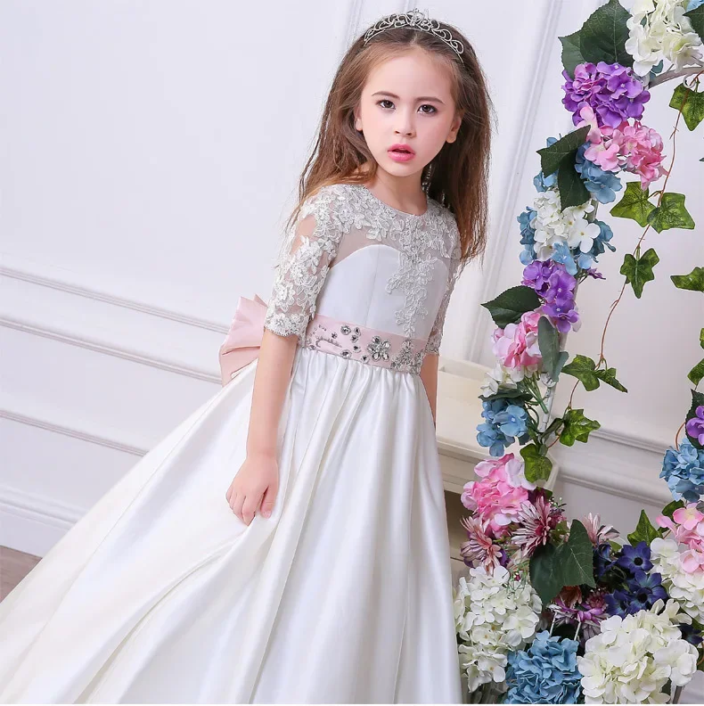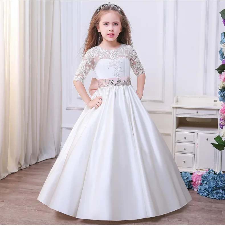 Weiße Satin-Applikationen mit Schleife, Juwelen, Gürtel, halbe Ärmel für Hochzeit, Geburtstag, Party, Erstkommunion, Kleider für Blumenmädchen