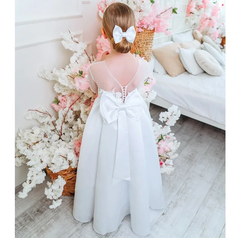 Weiße Satin-Applikationen mit Schleife, lange Ärmel, für Hochzeit, Geburtstag, Party, Bankett, Prinzessinnenkleider, Blumenmädchenkleider, Prinzessinnenkleid