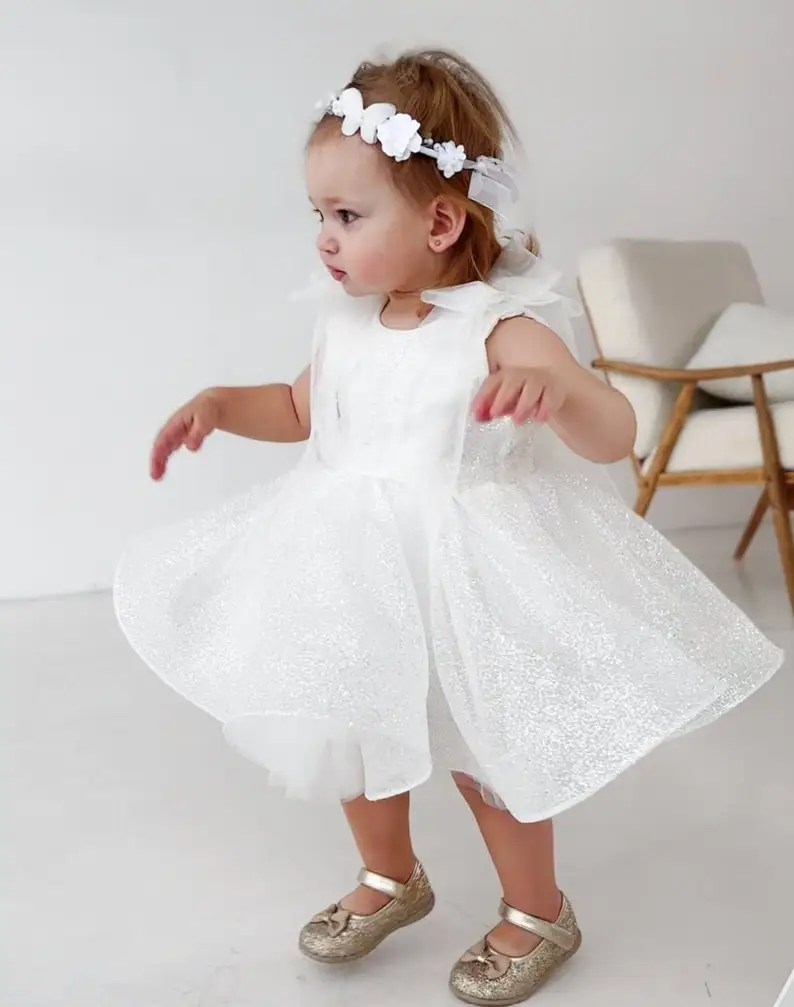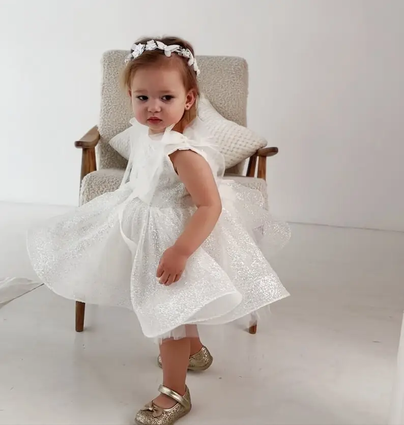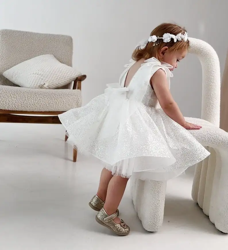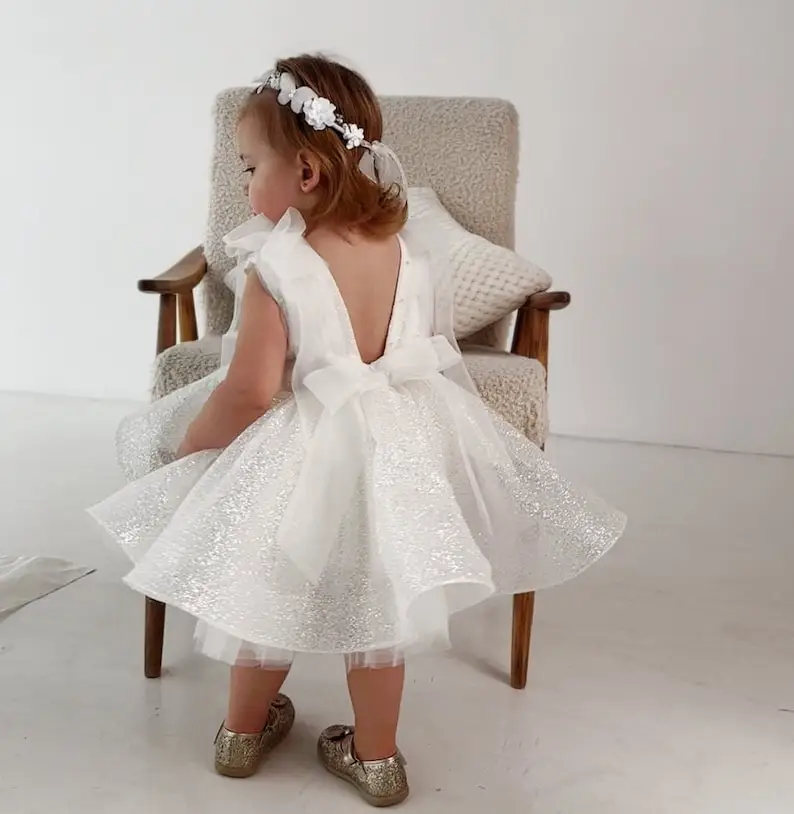 Weißes funkelndes Blumenmädchenkleid, Geburtstagskleid, Glitzerkleid für Kleinkinder, Abschlusskleid, Erstkommunionkleid, besonderer Anlass